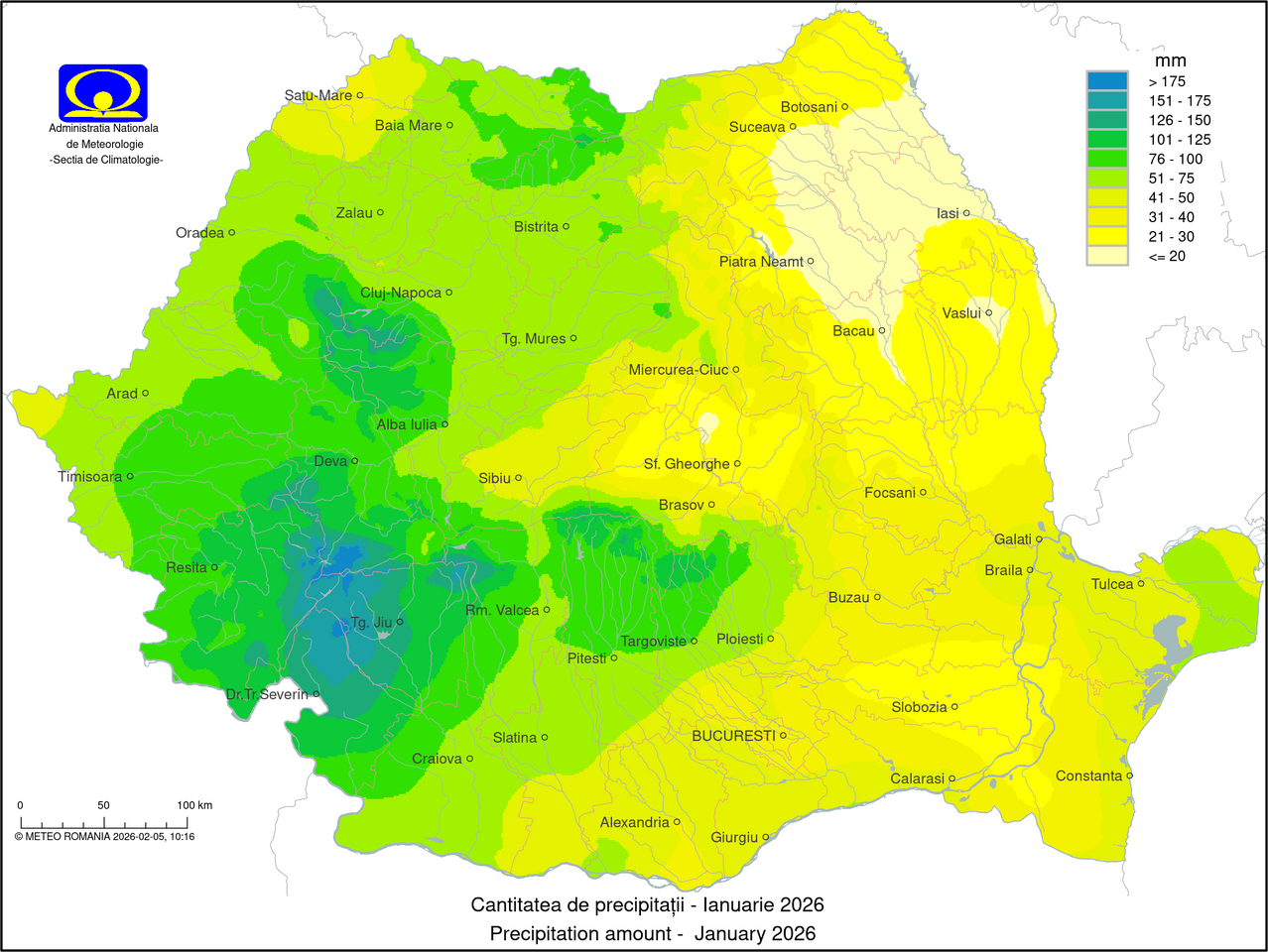 În intervalul menționat vor fi precipitații în cea mai mare parte a țării. Va ploua, iar în noaptea de joi spre vineri (5/6 februarie) pe alocuri în Moldova și estul Transilvaniei va fi și lapoviță și ninsoare și se mențin condițiile de polei. La munte, la altitudini de peste 1500 m, vor predomina ninsorile.