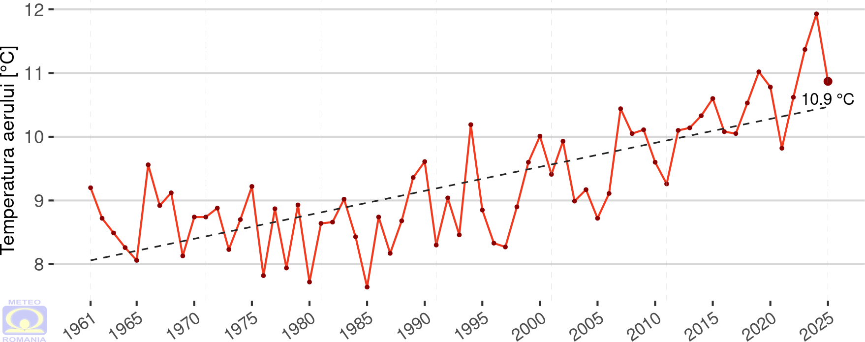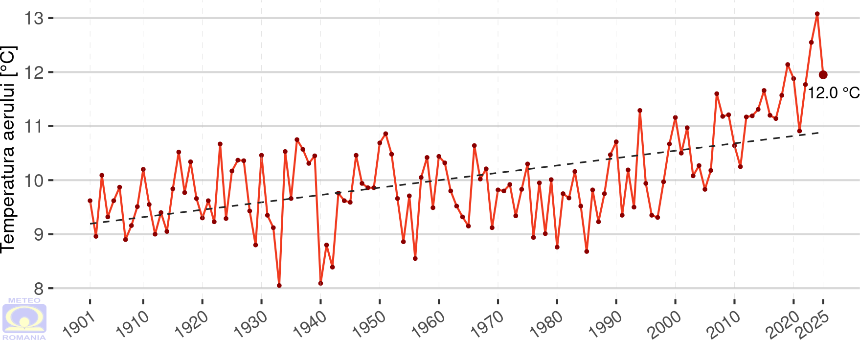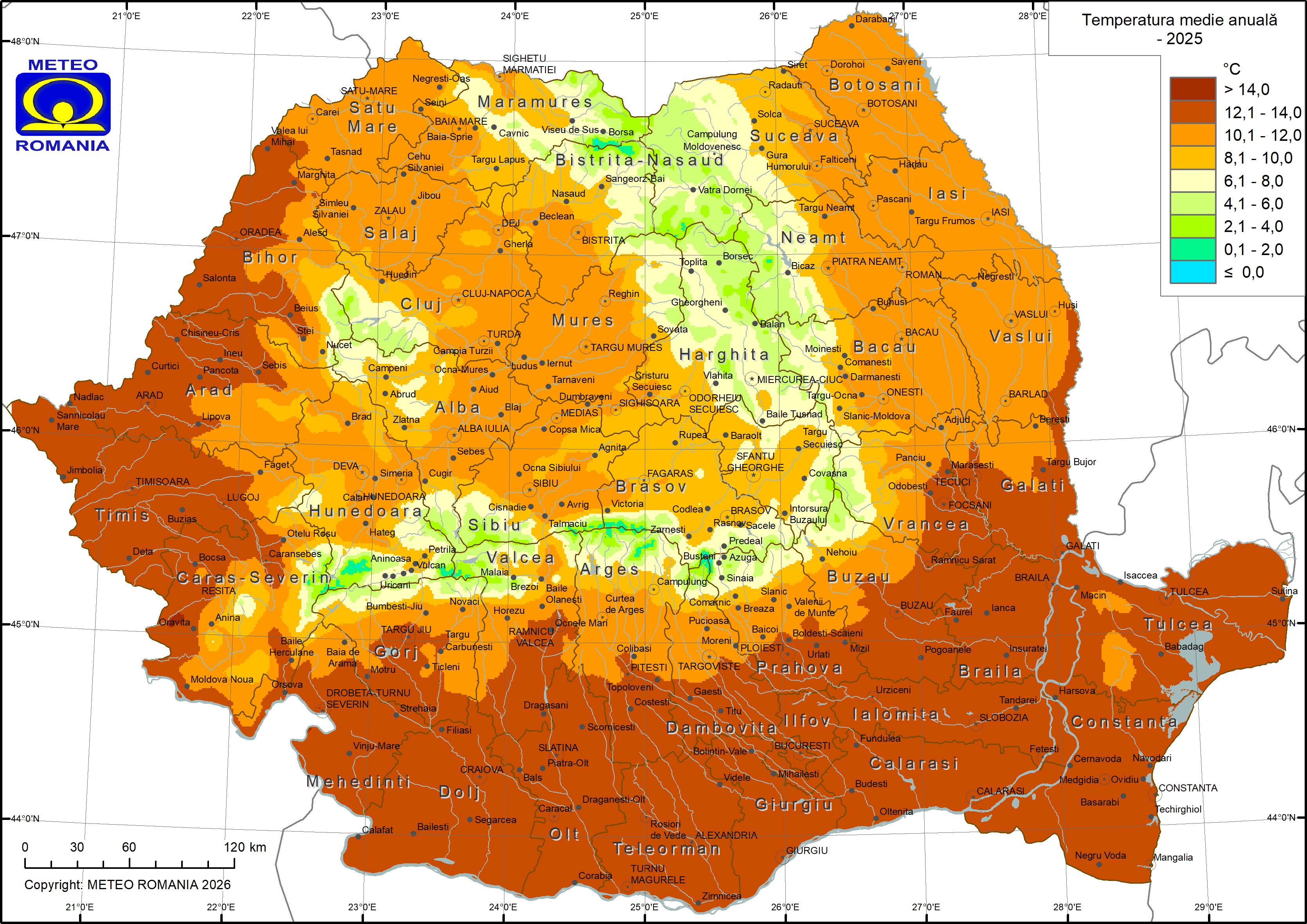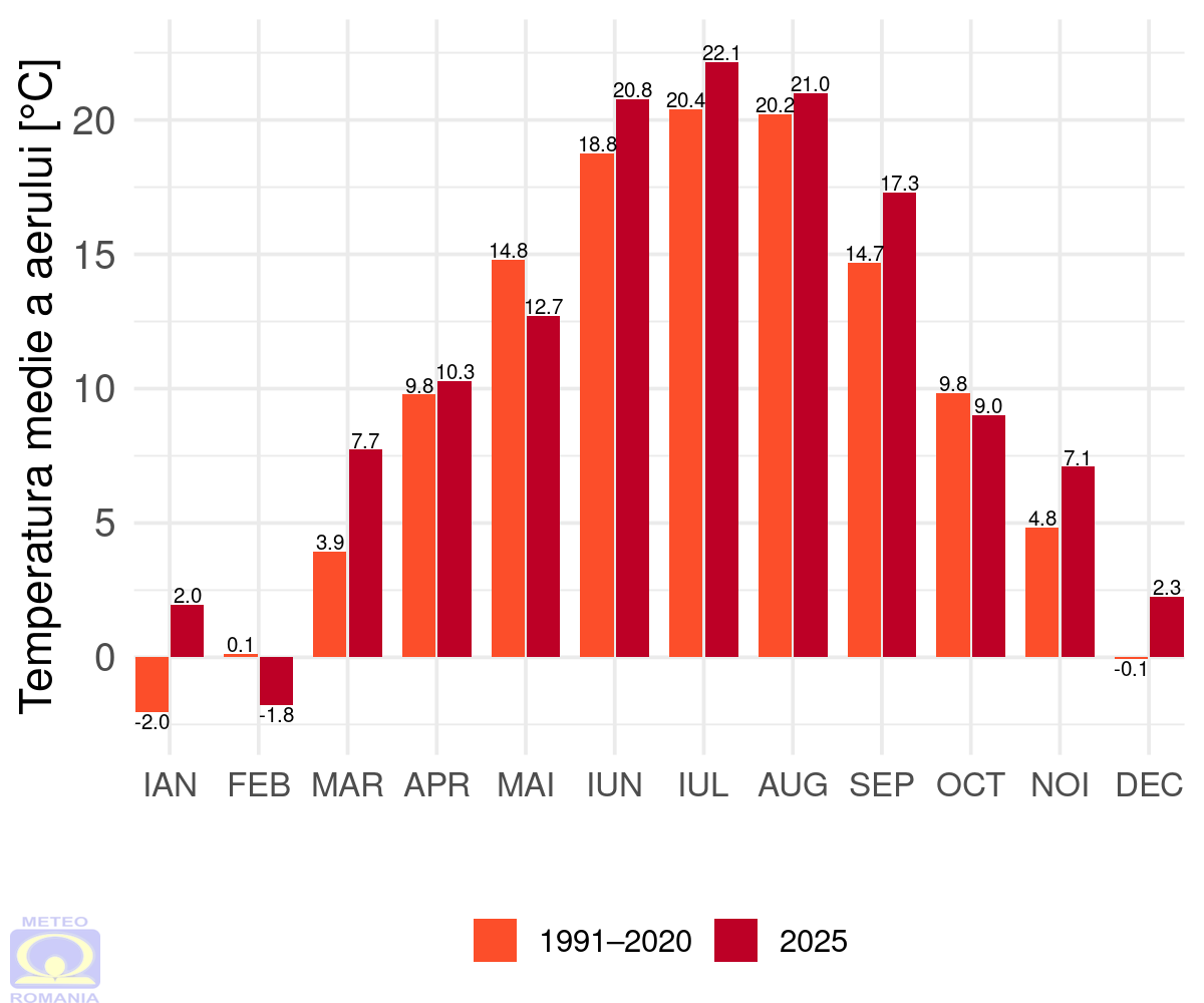 Temperatura medie pe ţară1, din anul 2025, a avut valoarea de 12,0 ºC, fiind cu 1,2 ºC mai mare decât mediana intervalului de referință standard (1991 – 2020) (Figura 1 și Figura 3).