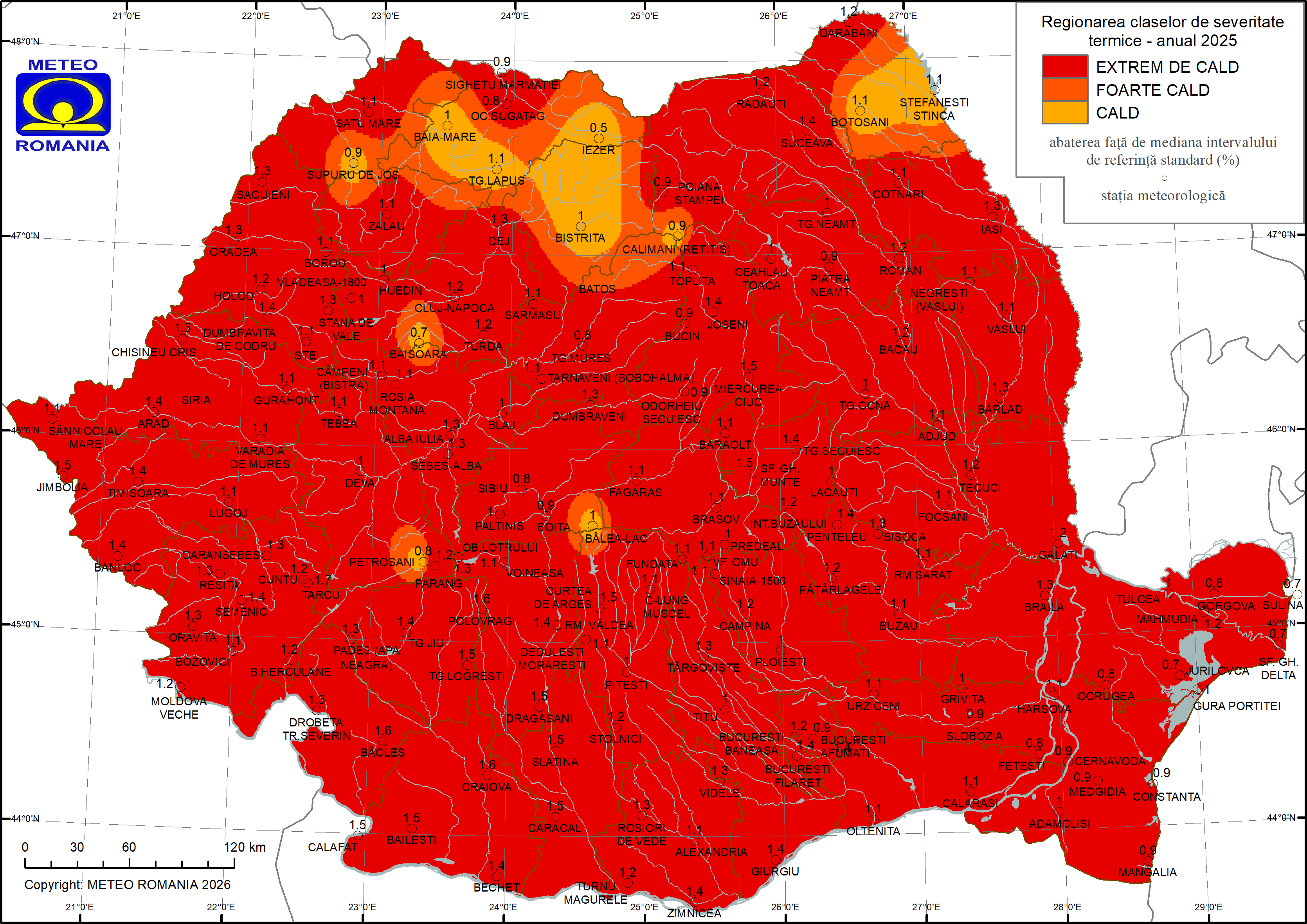 Abaterile temperaturii medii anuale față de mediana intervalului de referință standard (1991–2020) au fost exclusiv pozitive, cu valori cuprinse între aproximativ 0,5 °C și 1,7 °C. Cea mai mare abatere termică din acest an, respectiv 1,7 °C, s-a înregistrat în zona alpină, la stația meteorologică Țarcu (2180 m), situată în vestul Carpaților Meridionali. Valori ridicate, de peste 1,4°C, au caracterizat zone montane din Carpații Orientali (Penteleu) și Occidentali (Semenic), unele depresiuni (Miercurea Ciuc, Joseni, Sfântu Gheorghe-munte), precum și regiunile extracarpatice de câmpie, deluroase și submontane din Muntenia (inclusiv București-Filaret), Oltenia și izolat, din Banat. Abateri termice cuprinse între 1,0 și 1,4 °C au fost în cea mai mare parte a țării, incluzând areale extinse din Muntenia, Oltenia, Banat, Crișana, Transilvania și Moldova, inclusiv în zona alpină, la Vf. Omu. Valori mai reduse ale abaterii termice, sub 1,0 °C, s-au înregistrat în unele zone montane din Carpații Orientali și Occidentali, în unele depresiuni (Petroșani), precum și izolat în Maramureș, Moldova, Muntenia, Transilvania, zona litorală și Delta Dunării.