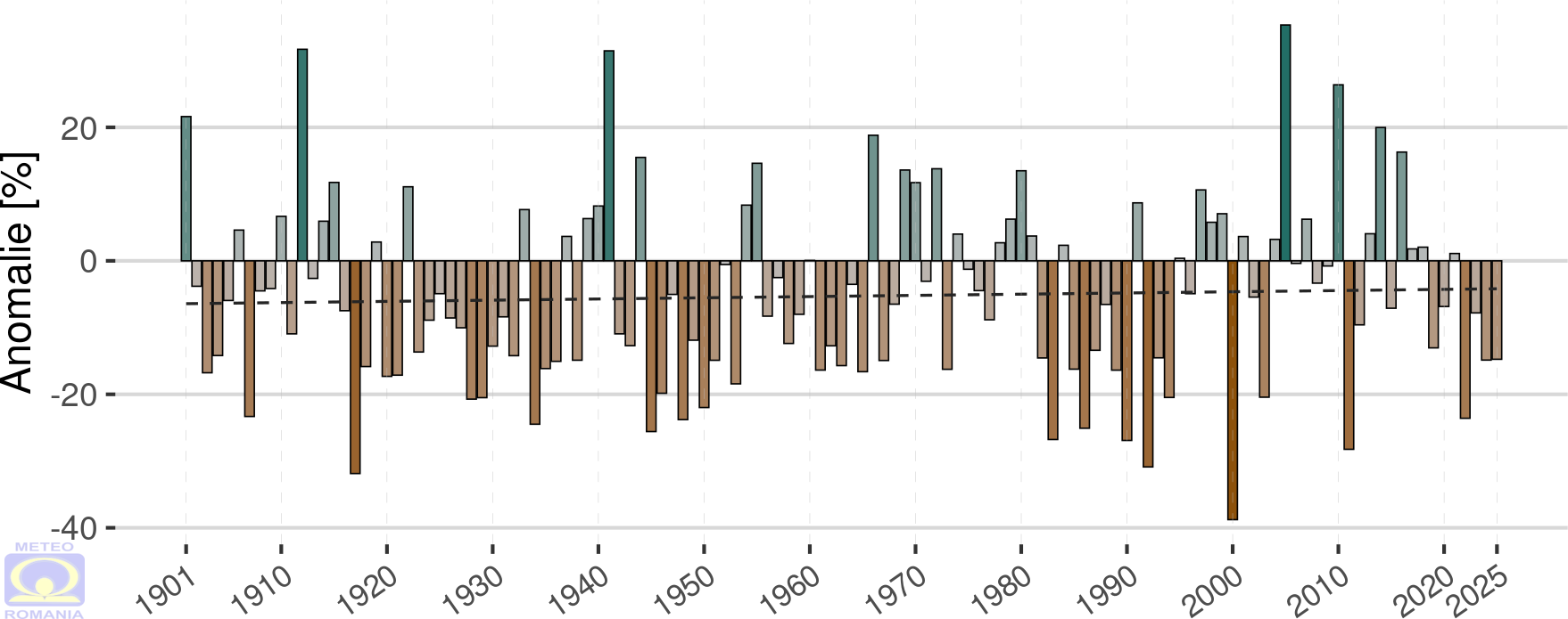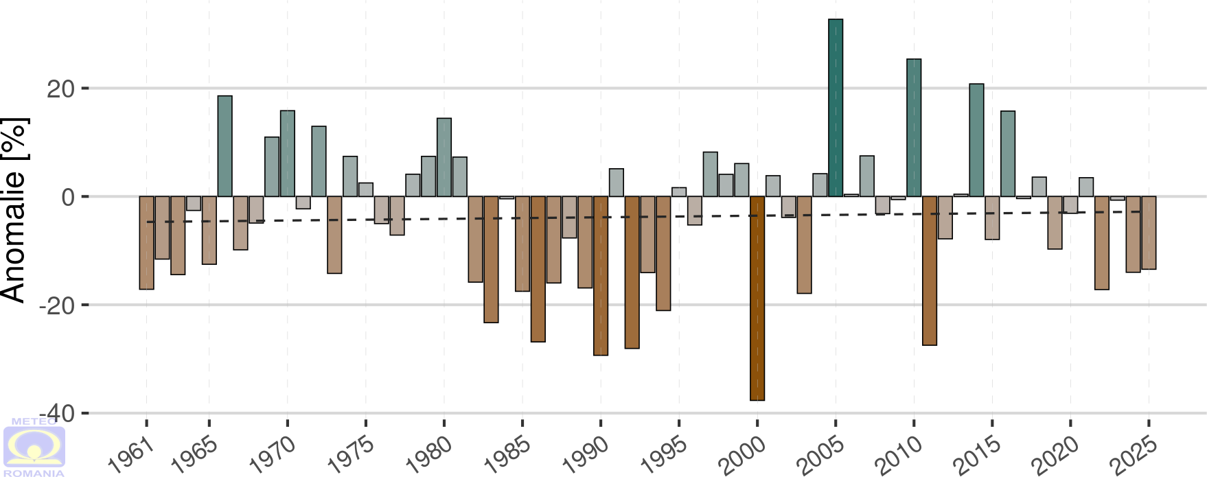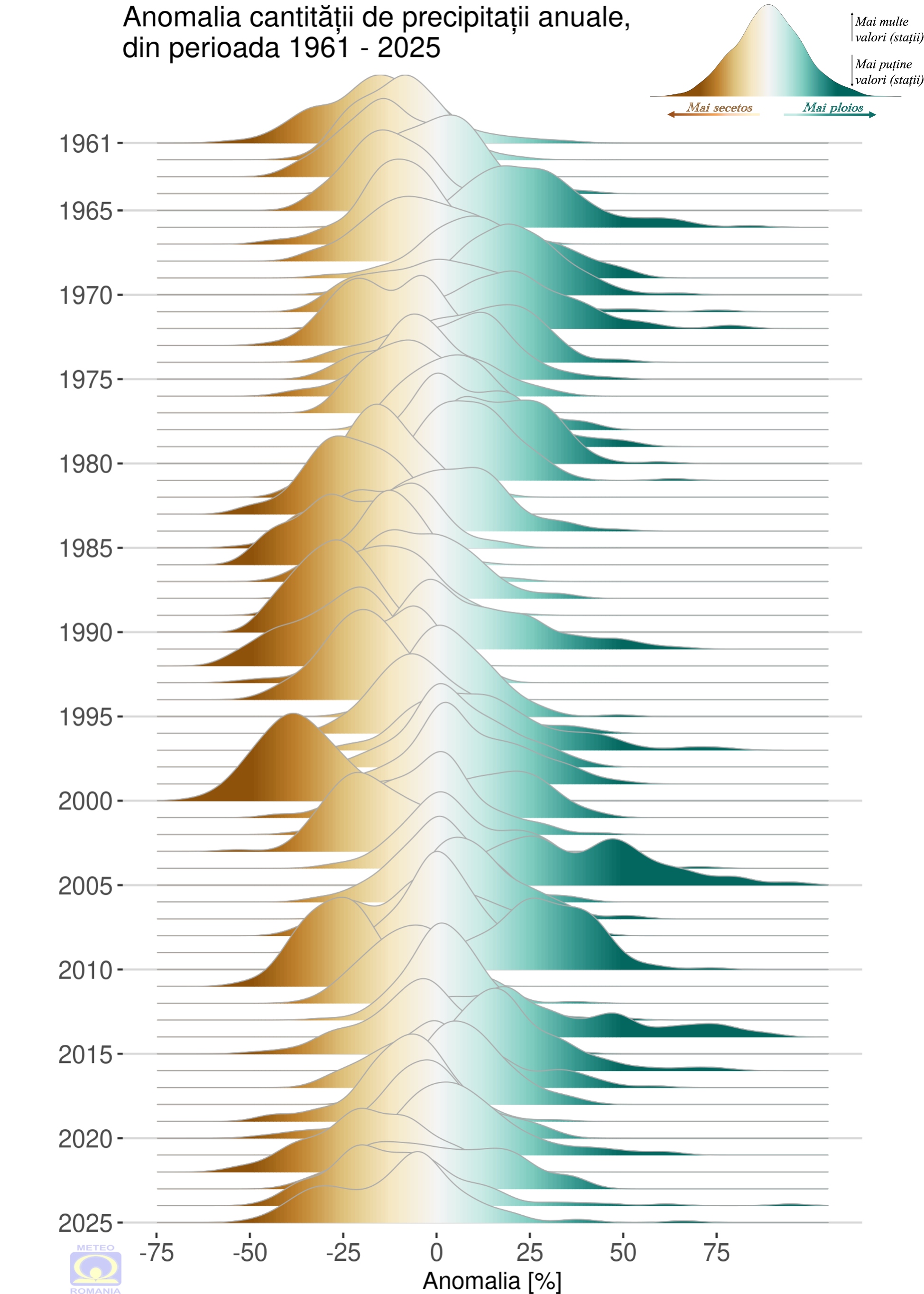 Dacă în cazul distribuției temperaturilor anuale se remarcă o creștere clară a anomaliilor pozitive din ultimii 30 de ani, în cazul distribuției abaterii cantității anuale de precipitații, din perioada 1961 – 2025, nu se poate identifica un semnal climatic concludent, de creștere sau scădere (Figura 17). Cu toate acestea, anul 2025 a fost un an deficitar, caracterizat prin dominanța anomaliilor negative cu valori cuprinse între -10 și -30%, chiar dacă s-au înregistrat extreme ale anomaliilor pozitive anuale de peste 50 %.