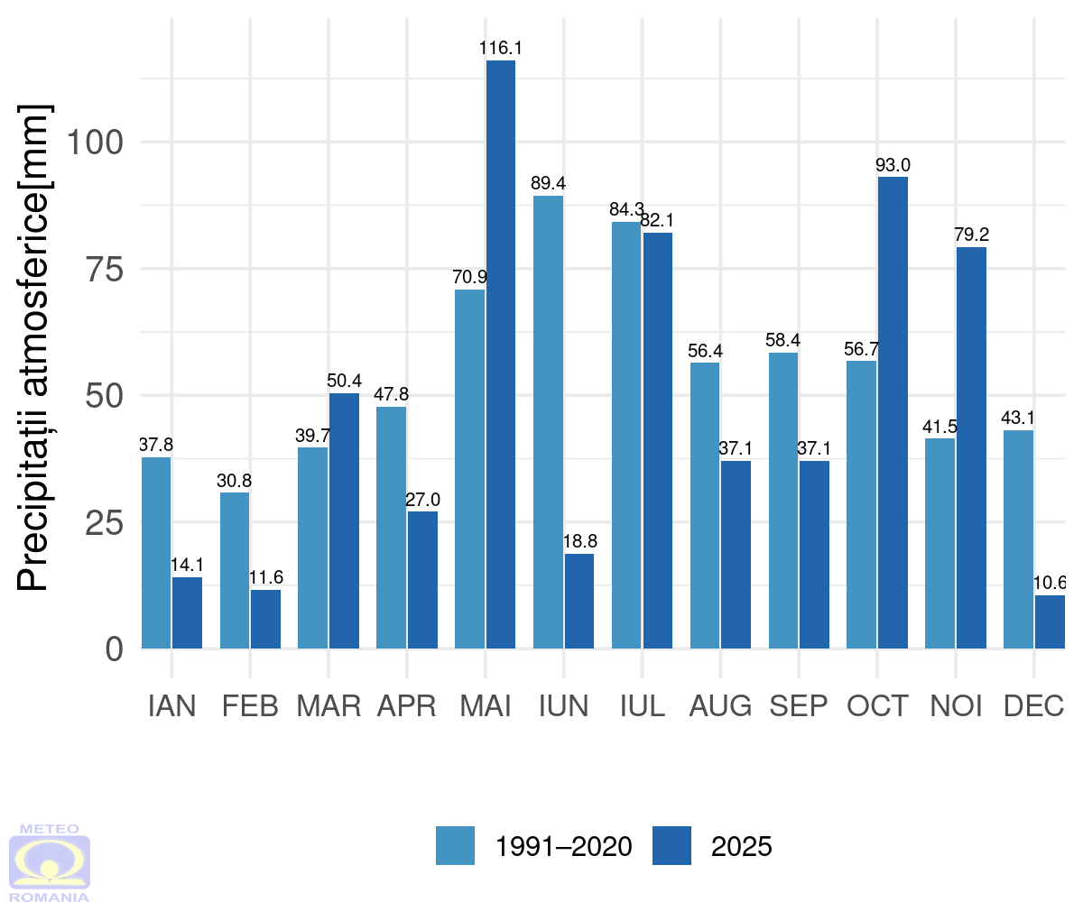 Cea mai mare cantitate de precipitații căzută în 24 de ore (mm), înregistrată în anul 2025, a fost 117,3 mm, la stația meteorologică Giurgiu, în 08 octombrie.
