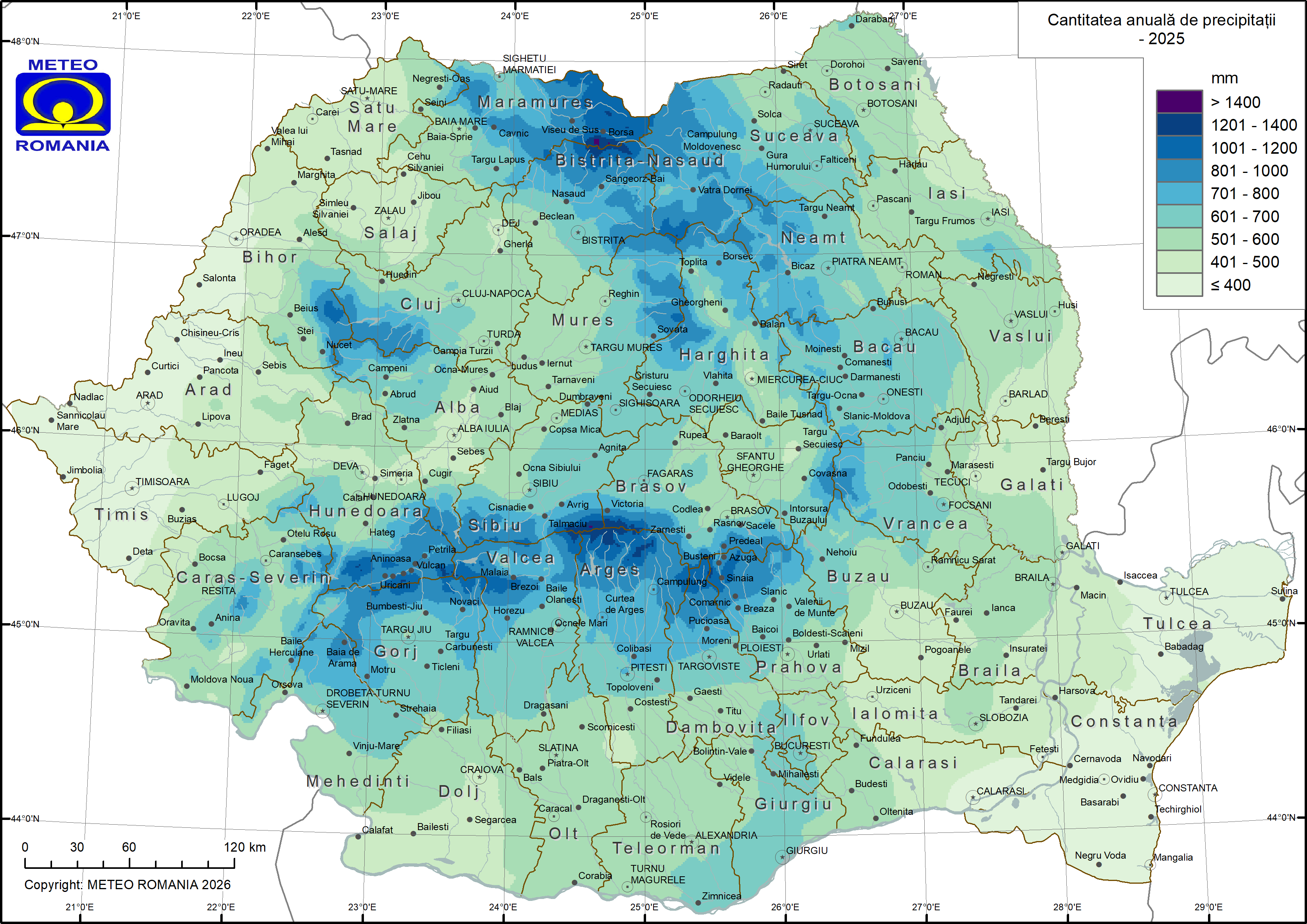 În anul 2025, distribuția cantităților anuale de precipitații evidențiază un ecart de variație larg, de la valori mai mici de 200 mm în unele areale joase din sud-estul extrem al țării, până la circa 1400 mm în zona alpină a Munților Făgăraș (Figura 18).