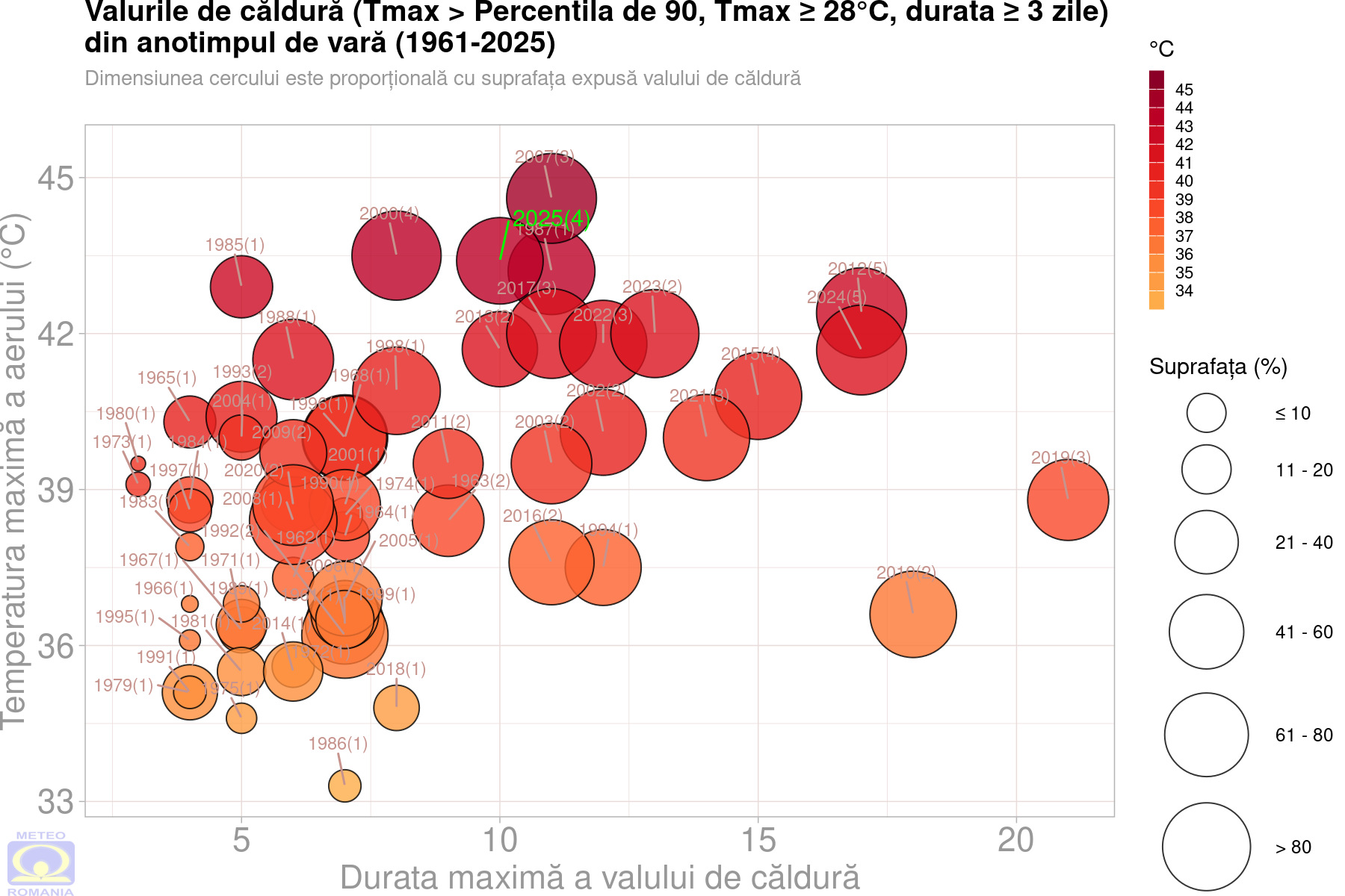În anul 2025 valurile de căldură4 s-au remarcat prin durata acestora, cât și prin mărimea suprafeței afectate.