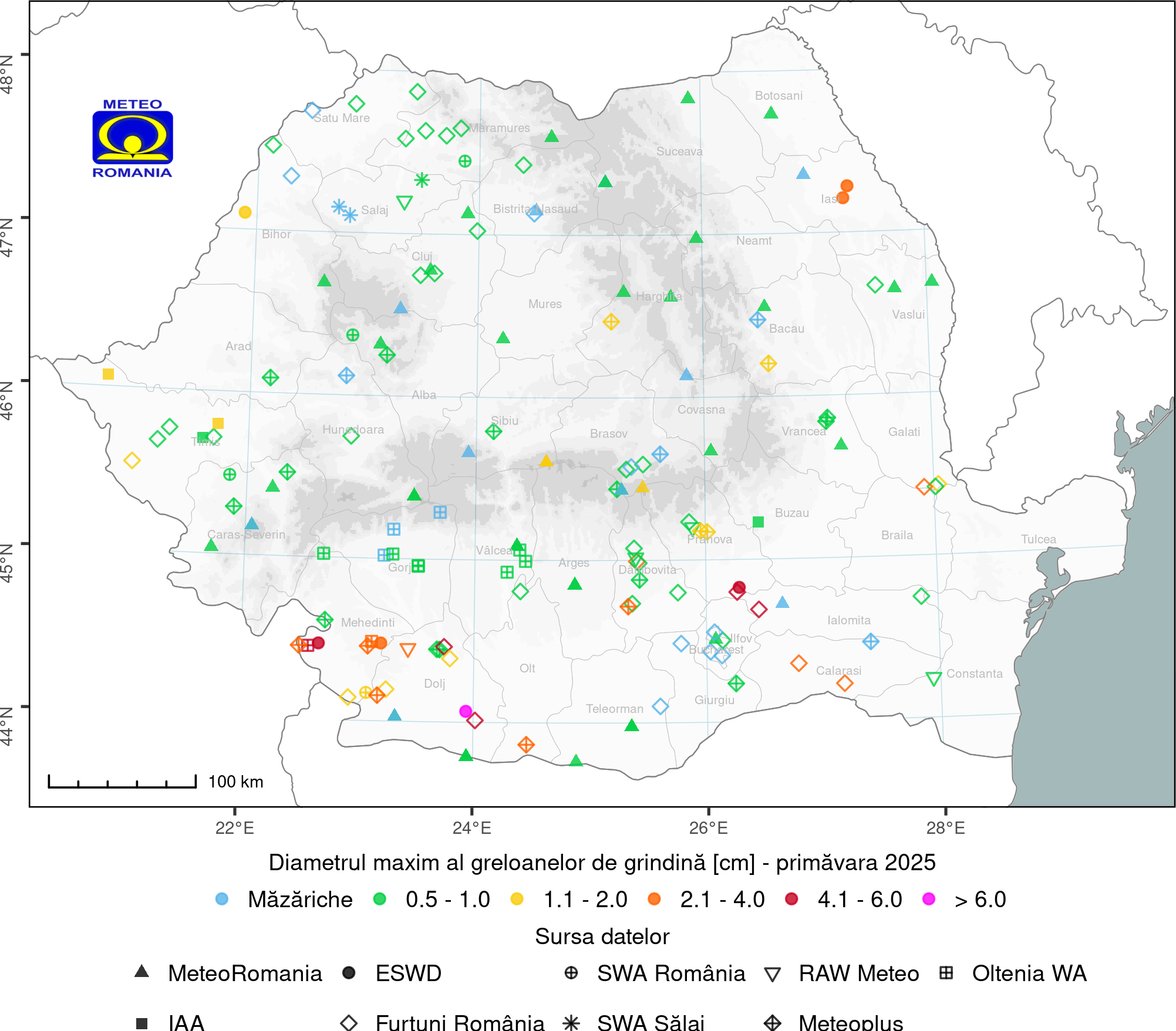 Sezonul convectiv a început în luna martie, când s-au înregistrat primele căderi de grindină din anul 2025. Astfel, căderile de grindină au avut o frecvența ridicată în sud-vestul țării, centrul Munteniei și nord-vestul țării, unde s-au înregistrat și cele mai mari valori ale diametrului greloanelor de grindină (> 4 cm) (Figura 21).