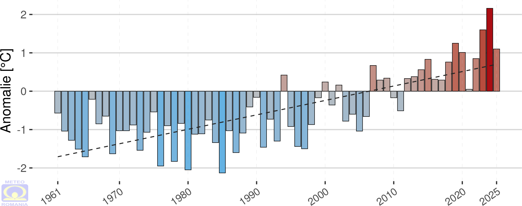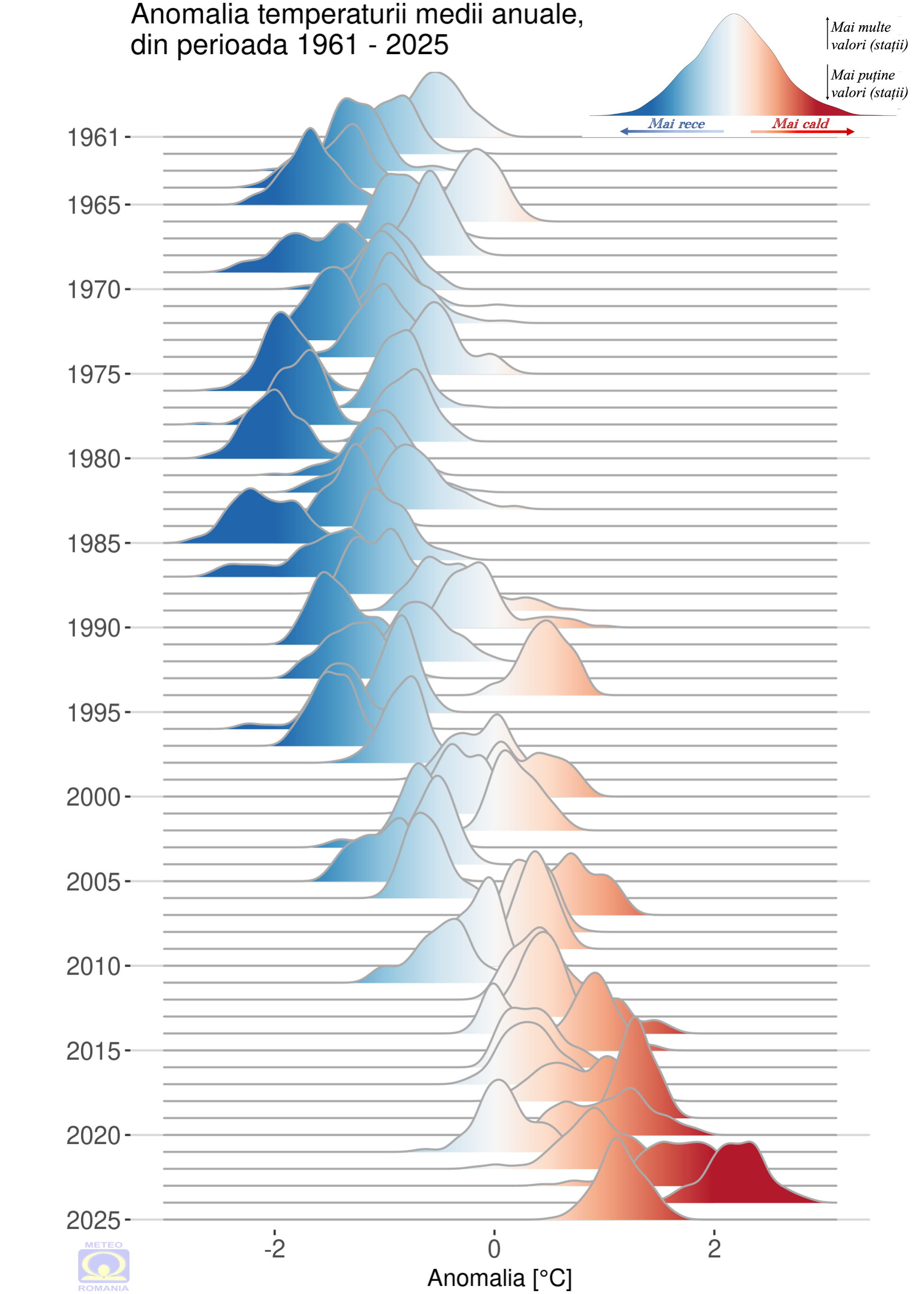 Distribuția abaterii temperaturii medii anuale, din perioada 1961 – 2025 (Figura 8), demonstrează procesul de încălzire climatică din ultimii 30 de ani, prin anomalii preponderent pozitive, înregistrate la majoritatea stațiilor meteorologice. În perioada 1961 - 1990, anomaliile negative sau apropiate de zero erau majoritare în cadrul distribuției lor la nivel național. Amploarea încălzirii, iese foarte bine în evidență în ultimii șase ani, când anomaliile temperaturii anuale depășesc 1,5 ºC la majoritatea stațiilor. Anul 2025 se remarcă, prin valori destul de mari ale anomaliilor anuale, cuprinse, în general, între 2,0 și 2,5 ºC.