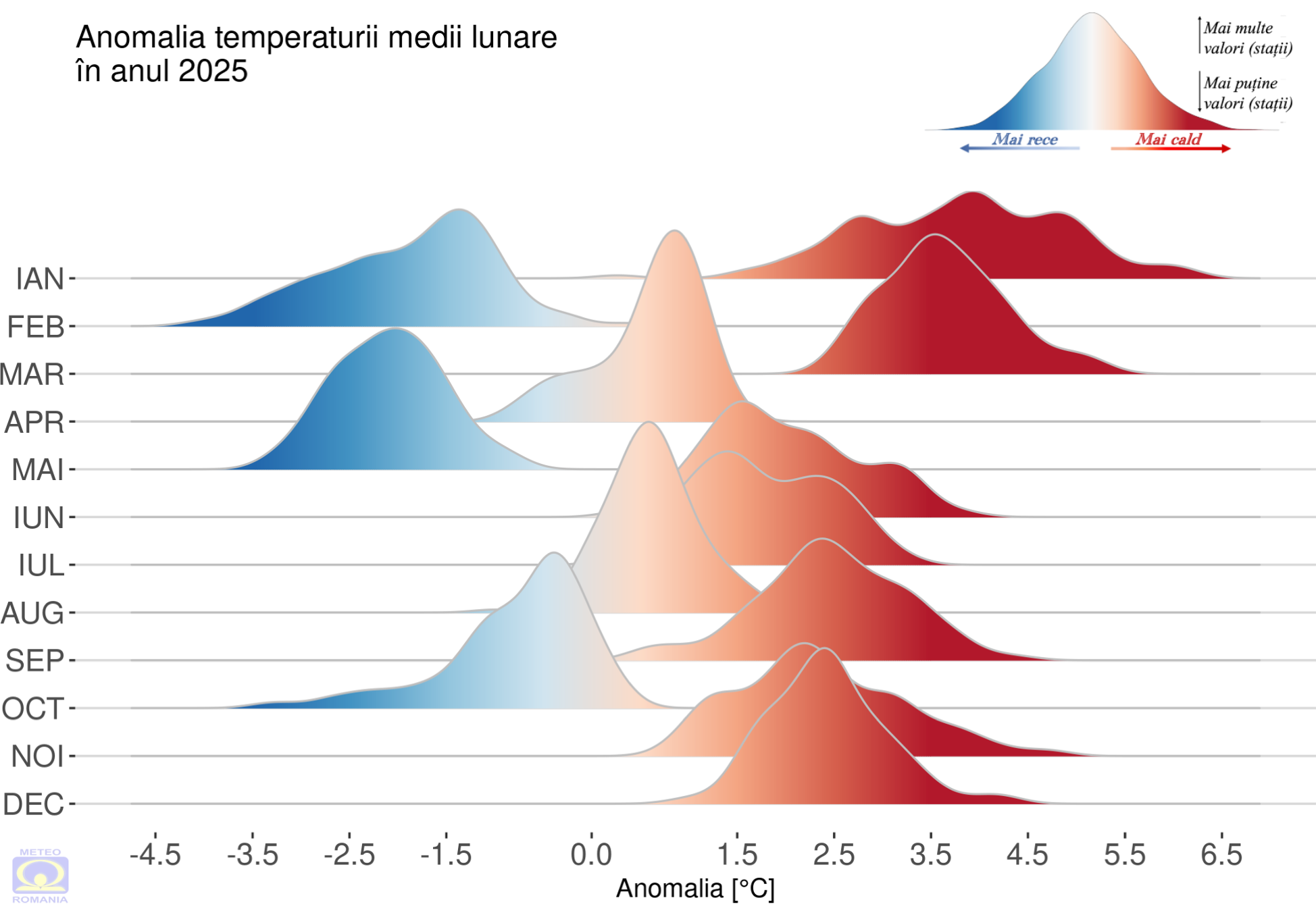 Din punct de vedere termic, anomaliile au fost pozitive în 9 din cele 12 luni ale anului. Temperatura medie lunară pe ţară2 a fost mai mare față de mediana intervalului de referință standard (1991 - 2020), având valori cuprinse între 0,5 ºC (aprilie) şi 4,0 ºC (ianuarie). În mai și februarie, abaterea a fost negativă, valorile acestora fiind -2,1 ºC și respectiv, -1,8 ºC (Figura 5). În anul 2025, cu excepția lunilor februarie, mai și octombrie, abaterile de temperatură au fost pozitive la majoritatea stațiilor meteorologice. Este de remarcat luna ianuarie care a fost foarte caldă, anomaliile pozitive fiind cuprinse între 4,0 și 6,5 ºC (Figura 6)În lunile mai reci (februarie, mai și octombrie), la multe stații meteorologice s-au înregistrat anomalii negative, cuprinse între -5,5 și -0,5 ºC. De asemenea, valorile temperaturilor medii lunare pe țară2, clasează ultimii cinci ani printre cei mai calzi din perioada 1961 – 2025 (Figura 7).