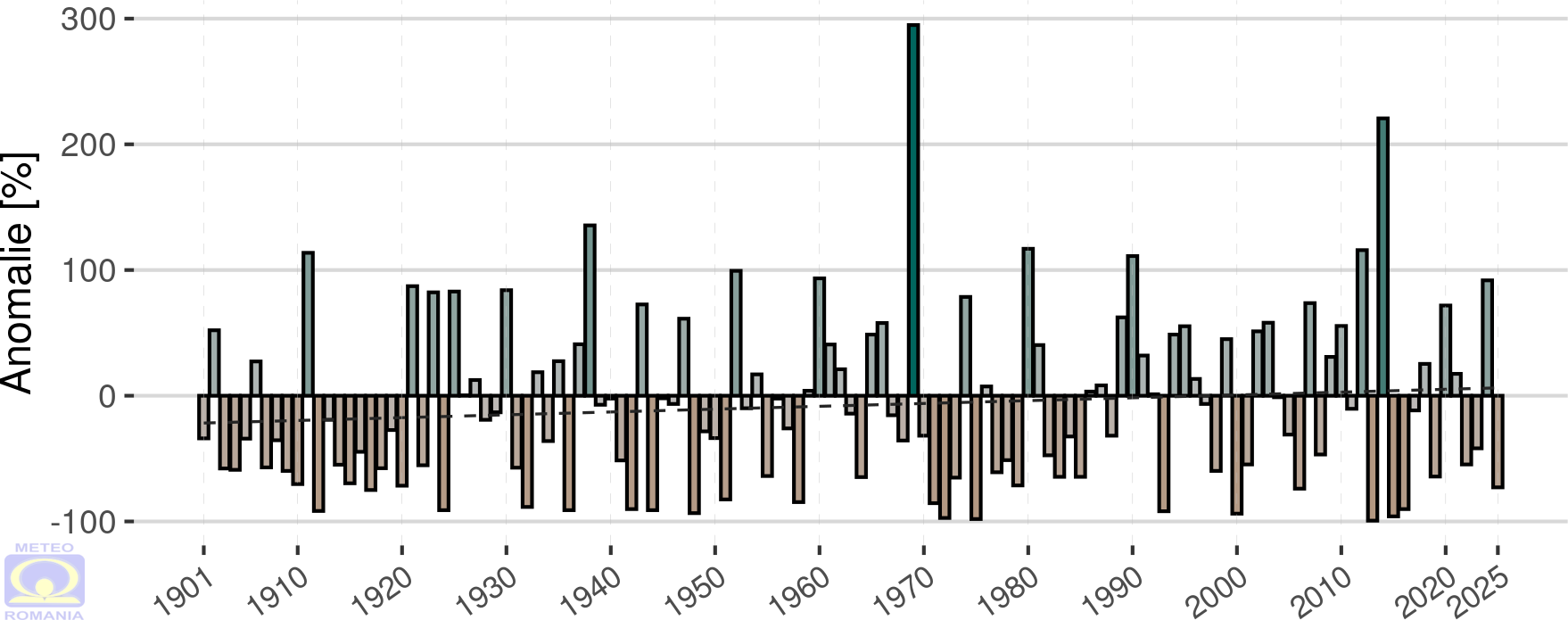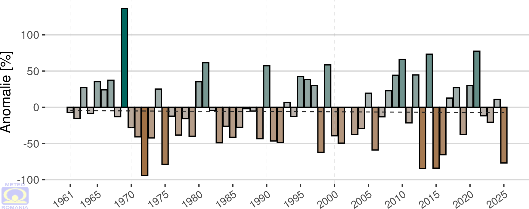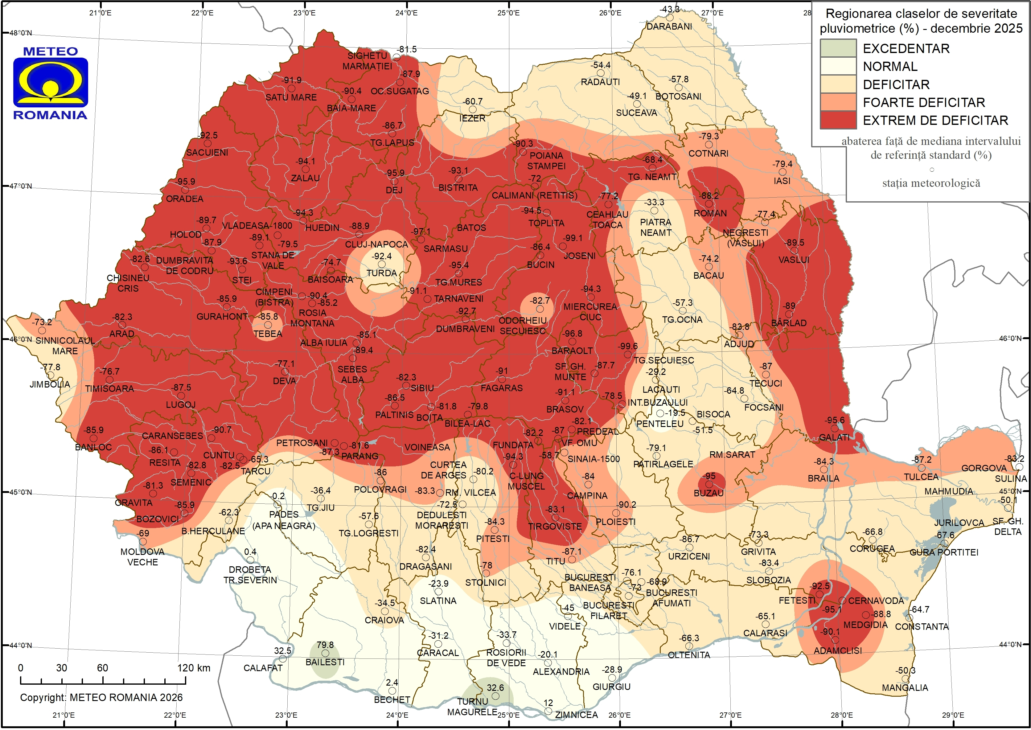 Abaterea cantității de precipitații din luna decembrie 2025 față de mediana intervalului de referință standard (1991 – 2020), calculată în procente, a fost negativă la cele mai multe stații meteorologice din rețeaua Administrației Naționale de Meteorologie (136 de stații). La 82 de stații meteorologice, majoritatea localizate în Transilvania, Maramureș, Banat, Crișana, Moldova și Dobrogea, abaterea negativă a depășit 80 %, iar la 31 dintre acestea, abaterea negativă a depășit 90 %. Cea mai mare valoare a abaterii negative a fost de 99,6 %, fiind înregistrată la stația meteorologică Târgu Secuiesc. Abateri pozitive s-au înregistrat la 6 stații meteorologice, localizate în sudul Olteniei și al Munteniei, iar cea mai mare valoare a abaterii pozitive a fost de 79,8 %, la Băilești.
