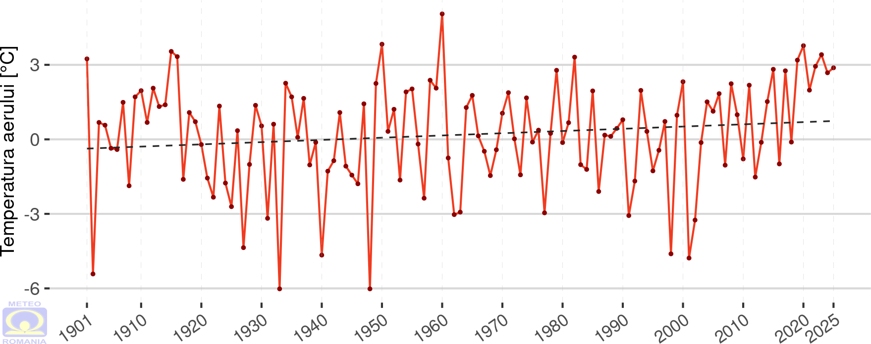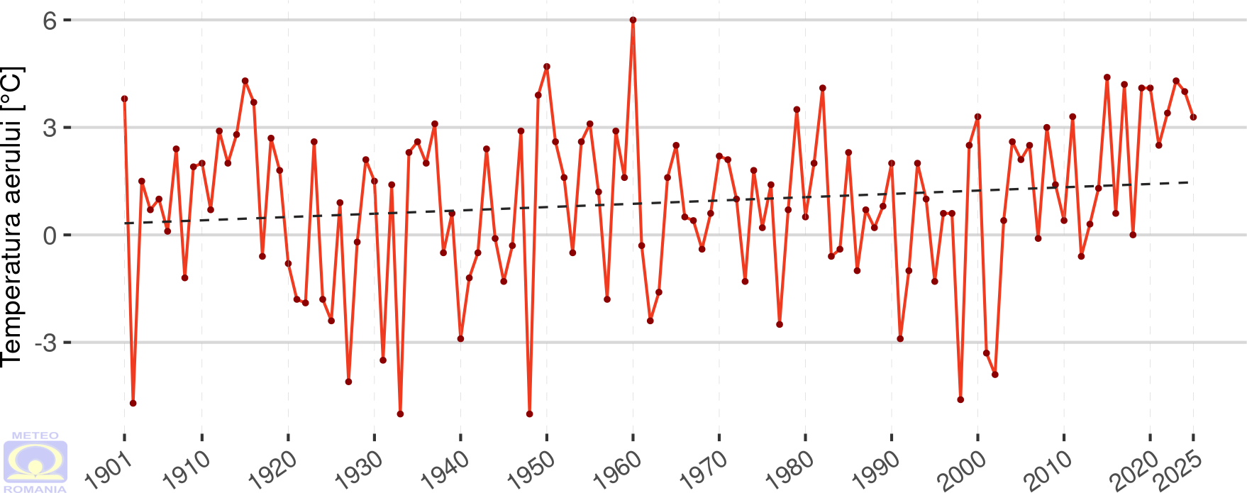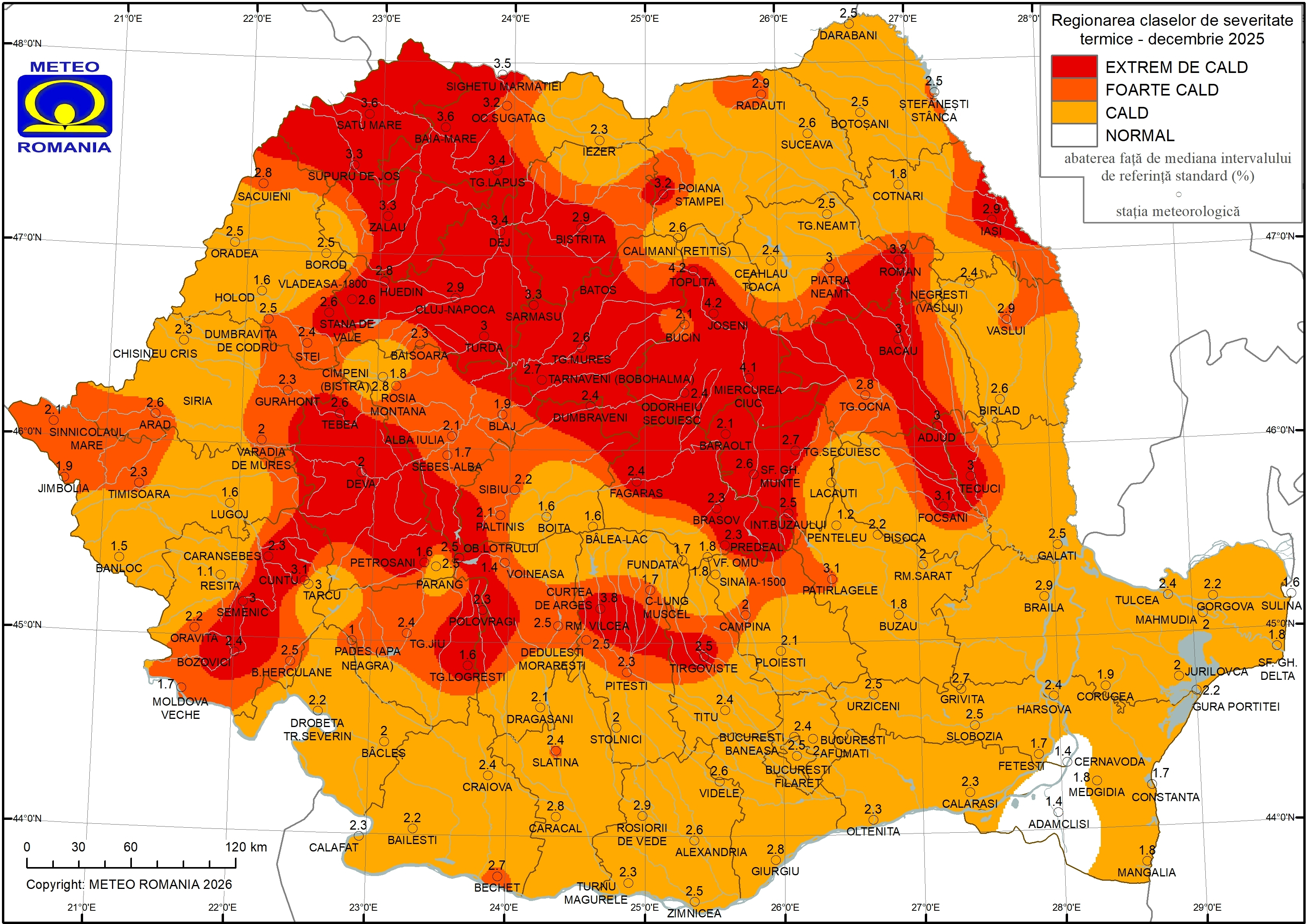 Abaterea temperaturii medii a aerului din luna decembrie 2025 față de mediana intervalului de referință standard (1991 - 2020) a fost pozitivă în întreaga țară, la toate stațiile meteorologice din rețeaua Administrației Naționale de Meteorologie valorile fiind ≥ 1 °C. La 114 stații meteorologice, repartizate în toate regiunile cu excepția Podișului Dobrogei, s-au înregistrat abateri de peste 2 °C. Cele mai mari valori ale abaterii temperaturii medii, de peste 4 °C au fost înregistrate în depresiunile din Carpații Orientali. Valoarea maximă a fost de 4,2 °C și s-a înregistrat la stațiile meteorologice Toplița și Joseni.