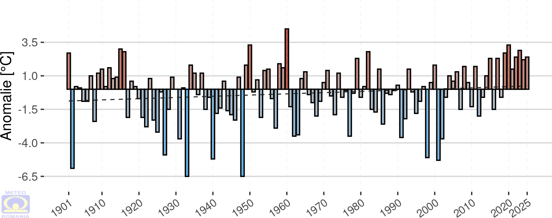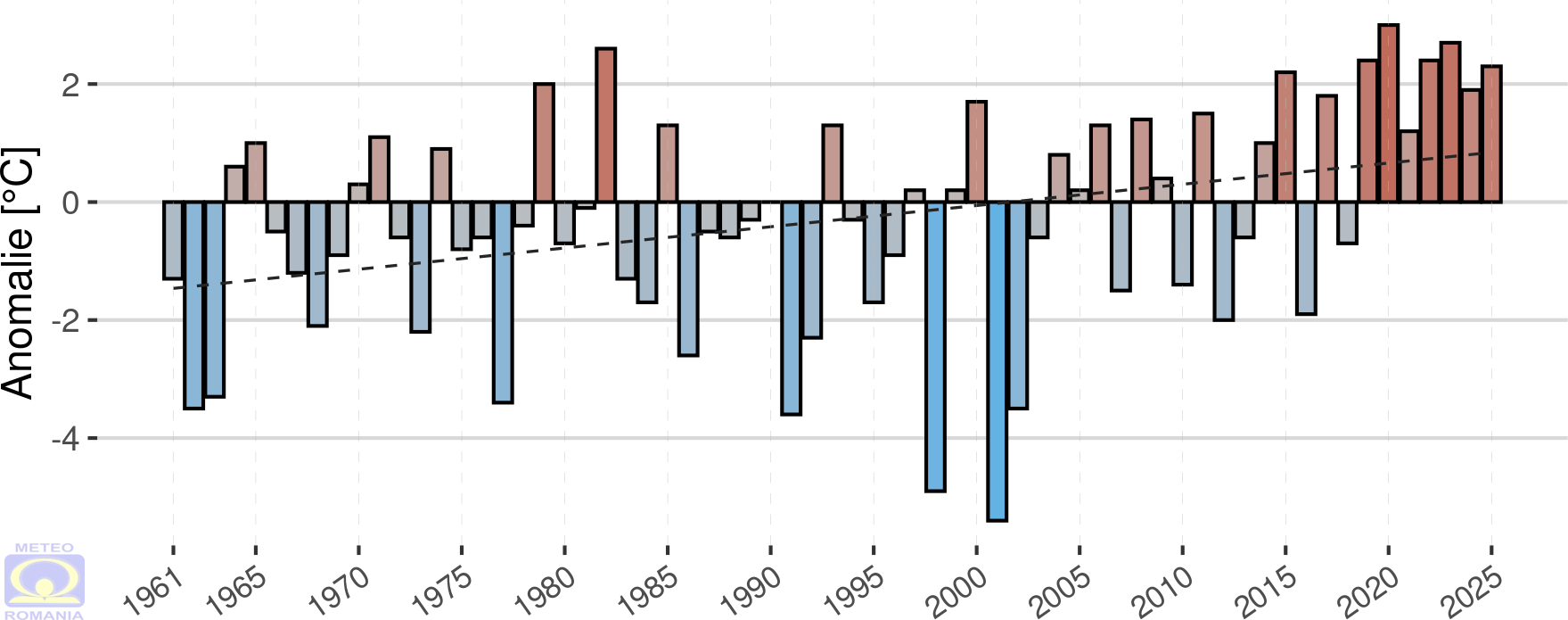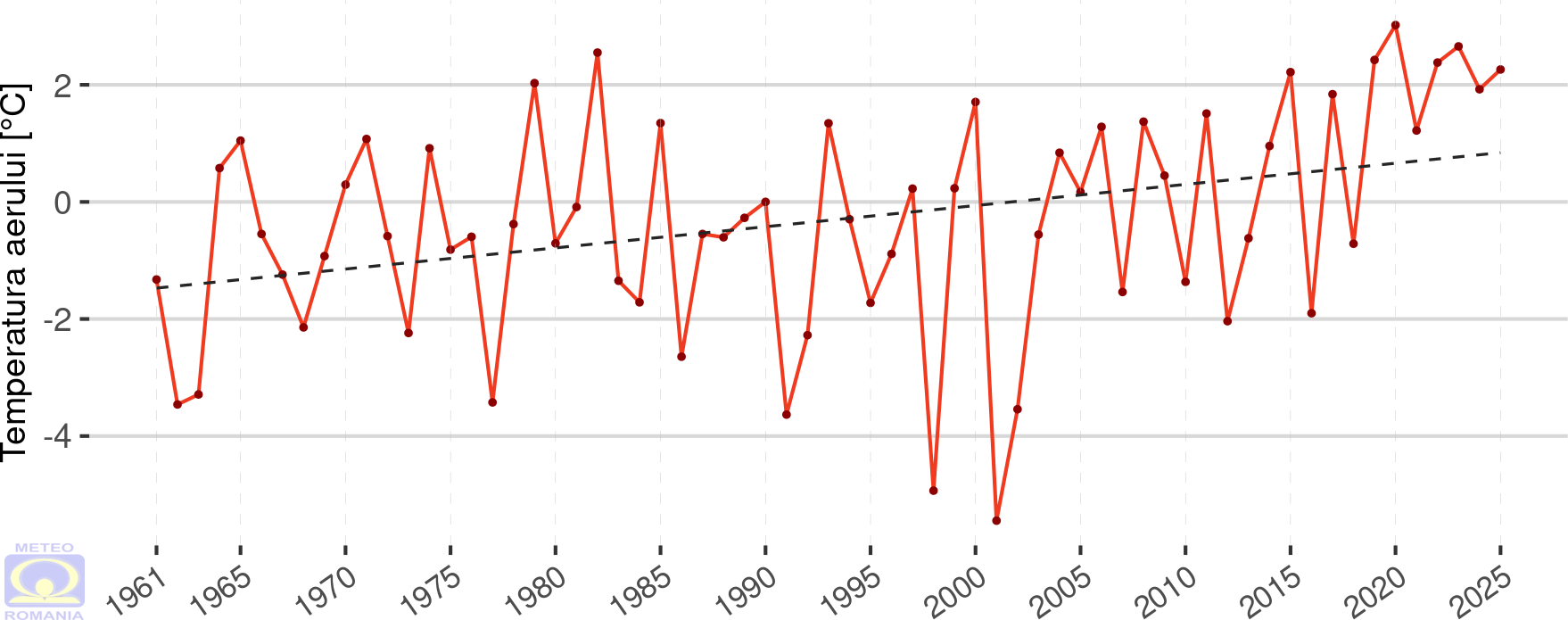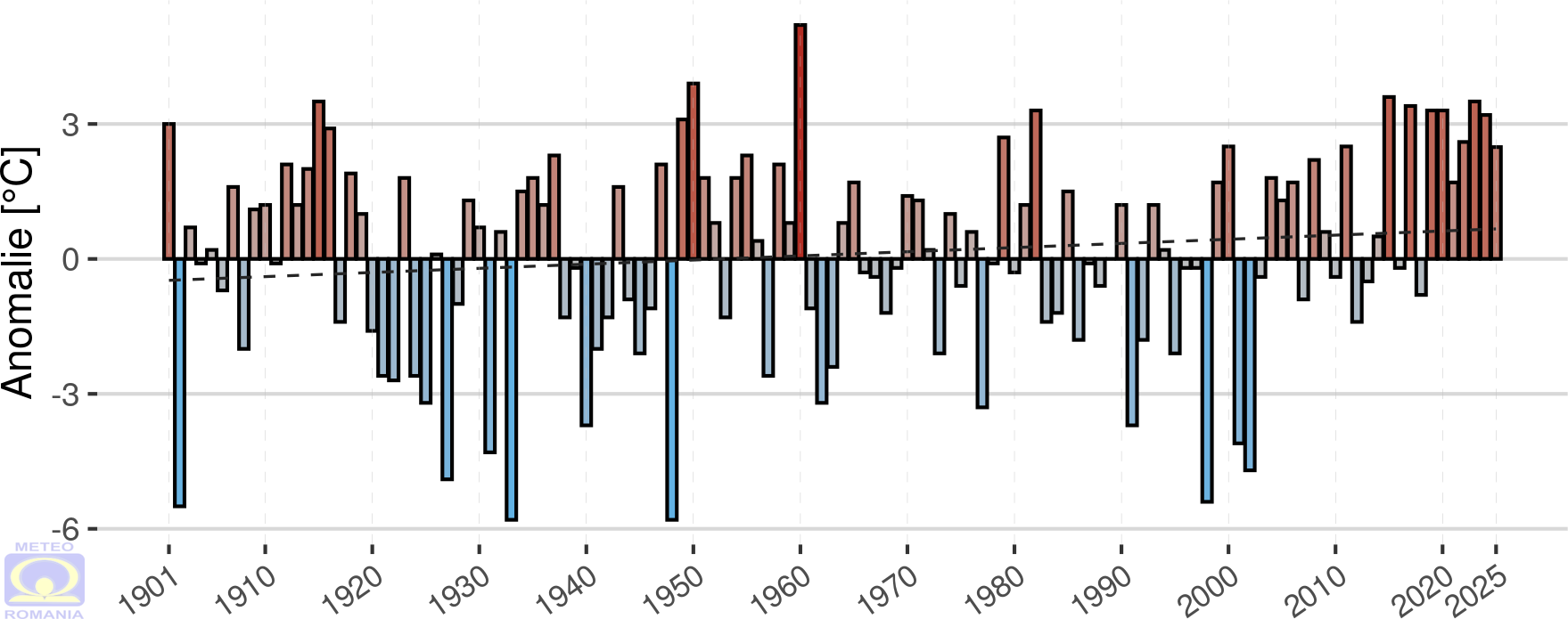 Abaterea temperaturii medii a aerului din luna decembrie 2025 față de mediana intervalului de referință standard (1991 - 2020) a fost pozitivă în întreaga țară, la toate stațiile meteorologice din rețeaua Administrației Naționale de Meteorologie valorile fiind ≥ 1 °C. La 114 stații meteorologice, repartizate în toate regiunile cu excepția Podișului Dobrogei, s-au înregistrat abateri de peste 2 °C. Cele mai mari valori ale abaterii temperaturii medii, de peste 4 °C au fost înregistrate în depresiunile din Carpații Orientali. Valoarea maximă a fost de 4,2 °C și s-a înregistrat la stațiile meteorologice Toplița și Joseni.