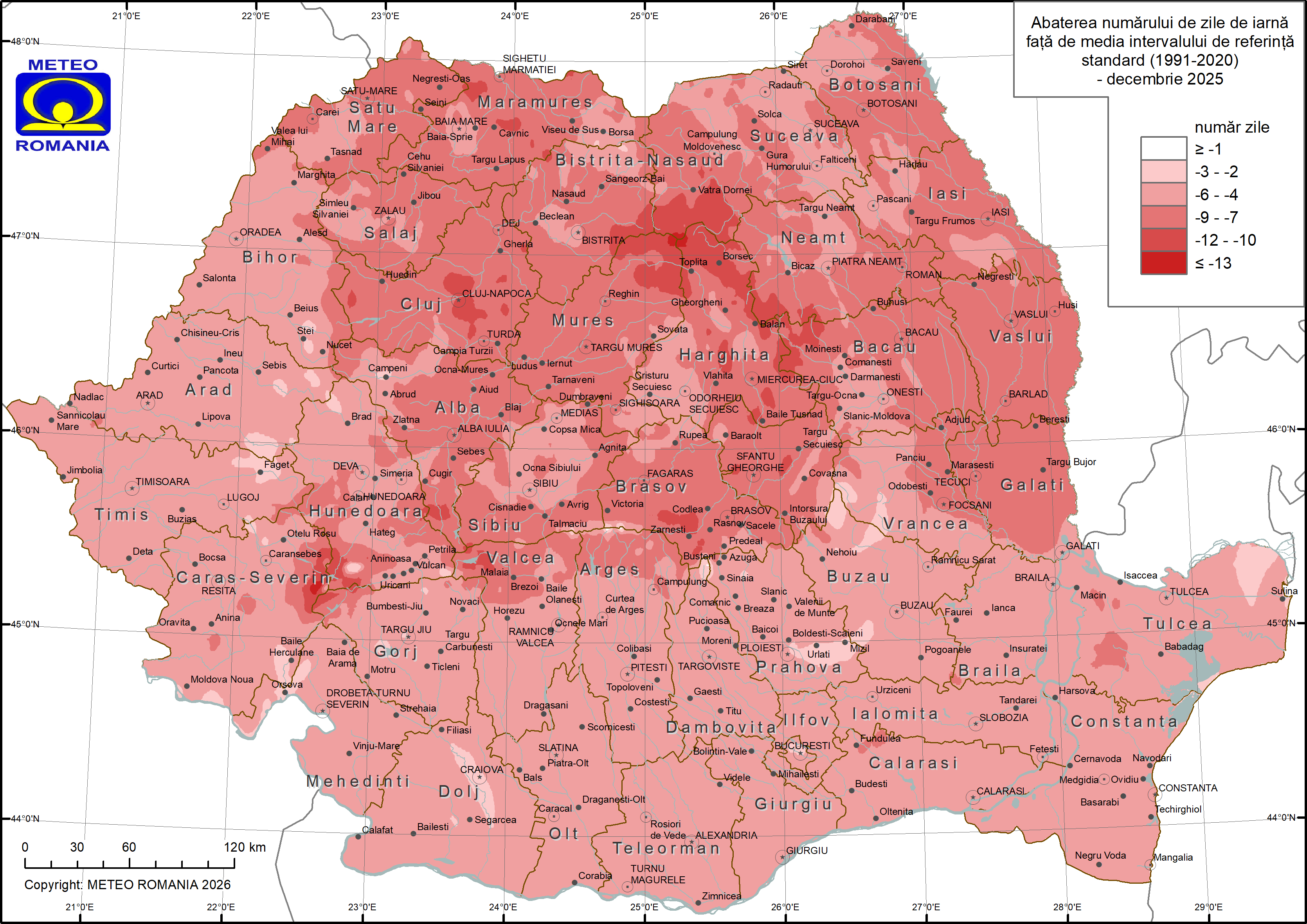 Analiza abaterii numărului de zile de iarnă din decembrie 2025 față de media intervalului de referință standard (1991 - 2020) evidențiază anomalii negative pe întreg teritoriul țării, indicând un număr mai redus de zile cu temperaturi maxime ≤ 0 °C comparativ cu normalul climatologic (figura 10). Cele mai pronunțate abateri negative, peste 15 zile, s-au înregistrat în zona montană înaltă din Carpații de Curbură, unde, chiar dacă frecvența zilelor de iarnă a fost mare, diferența față de media multianuală a fost semnificativă. Abateri negative cuprinse între 13 și 15 zile au caracterizat, în general, zona montană și centrul Transilvaniei, în timp ce valori de 10 – 12 zile s-au consemnat în Moldova, nordul Munteniei și în cea mai mare parte a Transilvaniei. În Muntenia, Oltenia și în vestul țării, abaterile negative au fost mai reduse, situându-se, în general, între 7 și 9 zile, iar în vestul Banatului, vestul Olteniei și în zona litorală, acestea au avut valori sub 6 zile, reflectând un caracter mai blând al regimului termic din această lună.