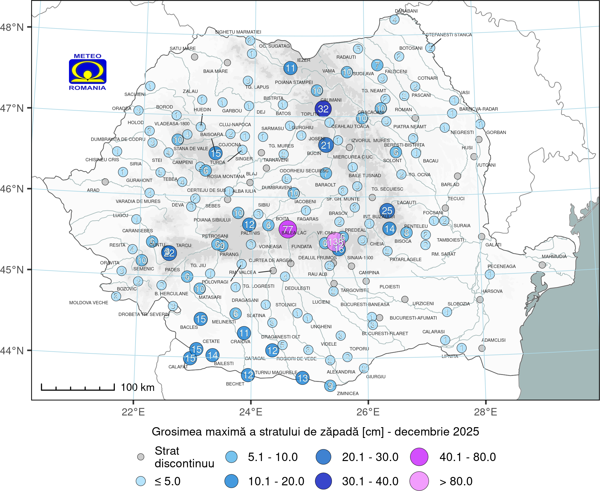Astfel, grosimea maximă a stratului de zăpadă din luna decembrie 2025 a depășit 30 cm la unele stații din zona montană (figura 17). Cea mai mare valoare, 138 cm, s-a înregistrat la stația meteo Vf. Omu (Munții Bucegi), iar la Bâlea Lac s-au măsurat 77 cm. În sud-vestul Olteniei, grosimea stratului de zăpadă a avut valori cuprinse între 10 și 15 cm. La stațiile meteorologice situate la altitudini mai mici de 800 m din Muntenia, Moldova și Transilvania, grosimea stratului de zăpadă a avut în general, valori sub 5 cm, iar pe areale extinse stratul de zăpadă a fost discontinuu.