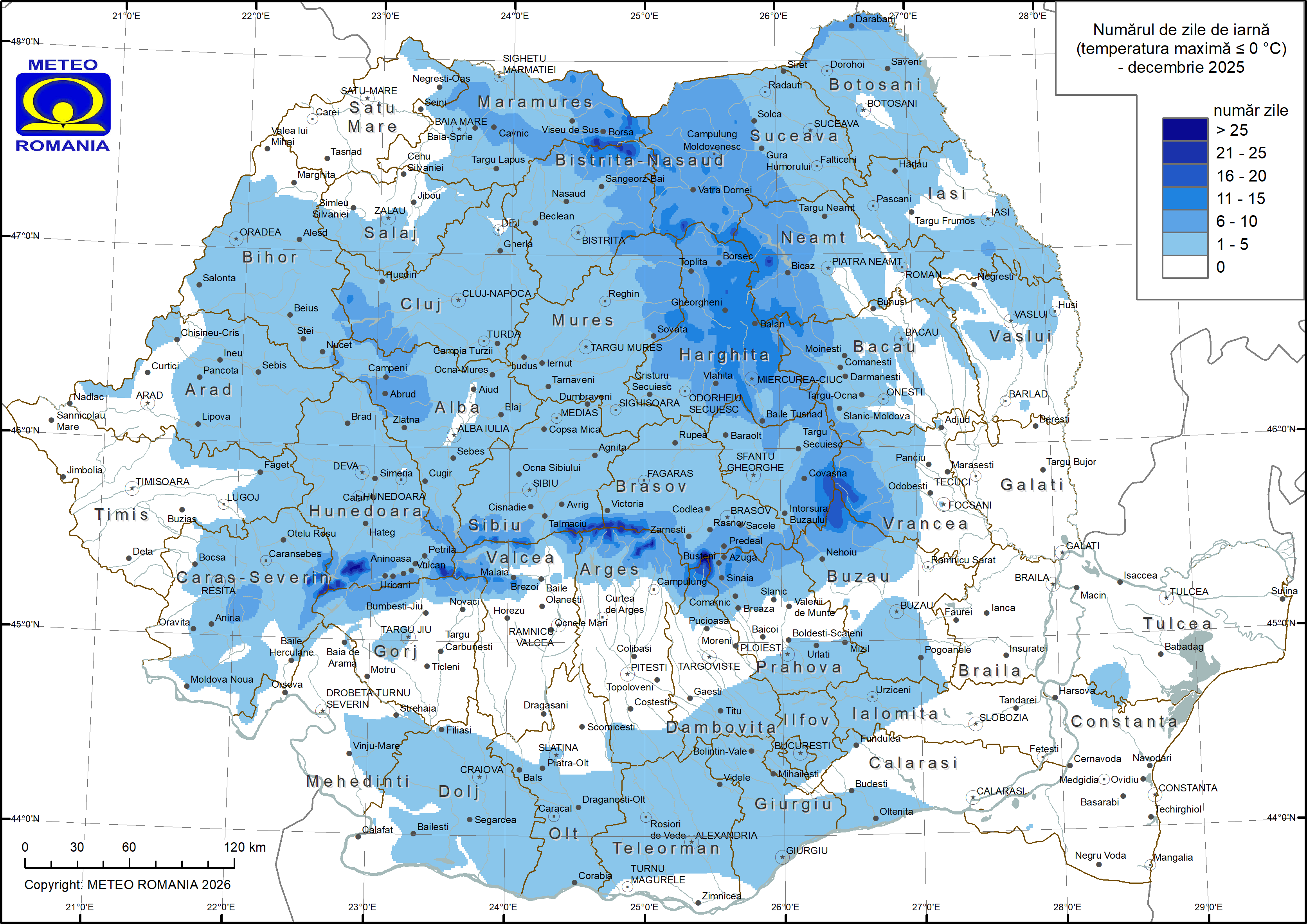 Chiar dacă decembrie 2025 a fost o lună caldă, în mai multe regiuni din țară, în special în zonele montane și depresionare, s-a înregistrat un număr ridicat de zile de iarnă.