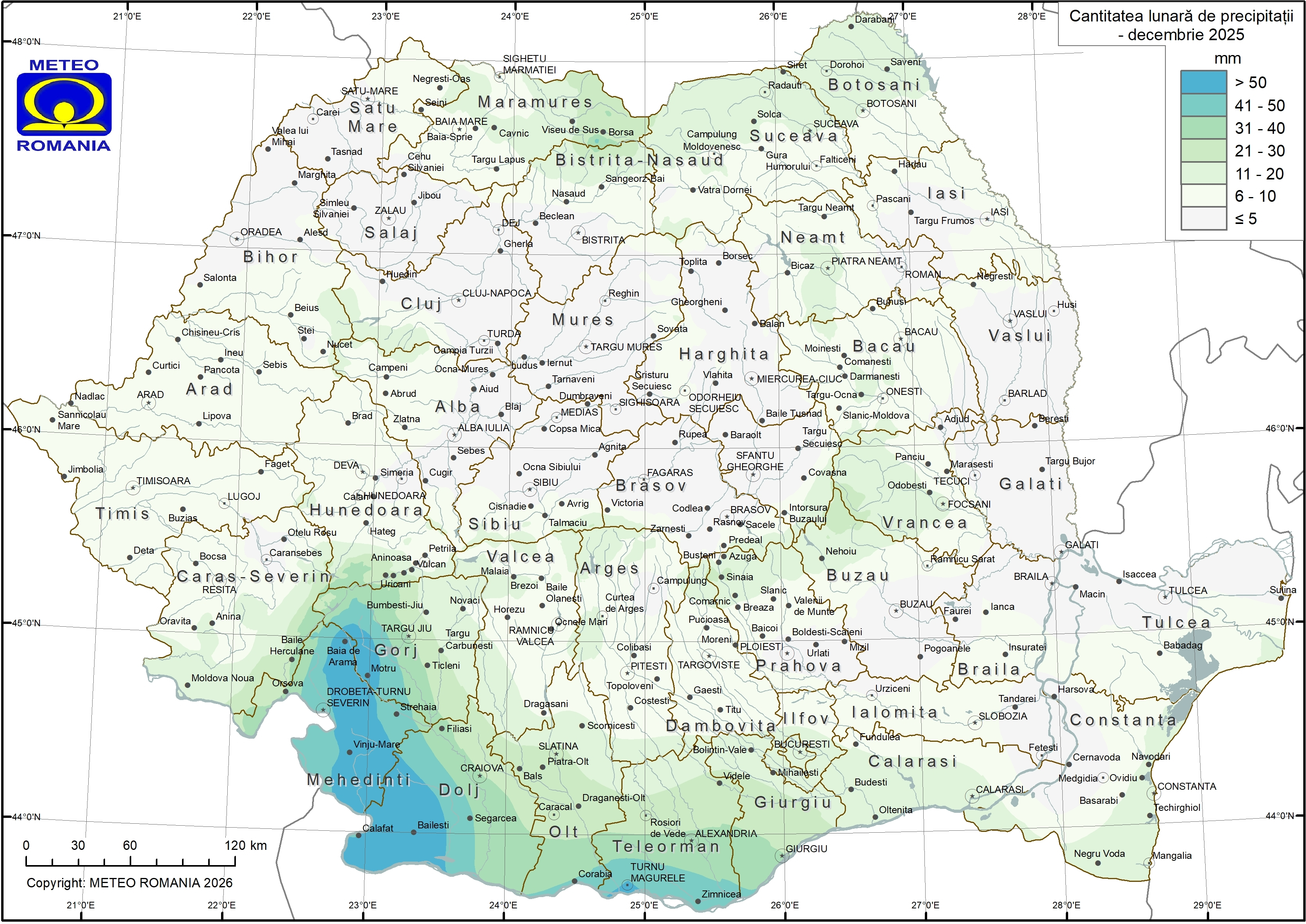 Cantitatea totală de precipitații din luna decembrie 2025 a avut valori sub 10 mm în cea mai mare parte a țării (figura 11). Valori cuprinse între 11 și 30 mm s-au înregistrat în nordul Moldovei, estul Maramureșului, nordul și centrul Olteniei, sudul și centrul Munteniei, în sudul Banatului și al Dobrogei, pe litoral, în zonele submontane din Oltenia, Muntenia și Moldova și pe areale restrânse din Munții Apuseni. Valori mai mari de 30 mm s-au înregistrat doar în Oltenia, Muntenia și izolat, în nordul Carpaților Orientali, iar peste 50 mm, în vestul și sud-vestul Olteniei, și izolat, în sud-vestul Munteniei. Cea mai mare cantitate lunară s-a înregistrat în județul Dolj, la stația meteorologică Băilești și a fost de 67,6 mm.