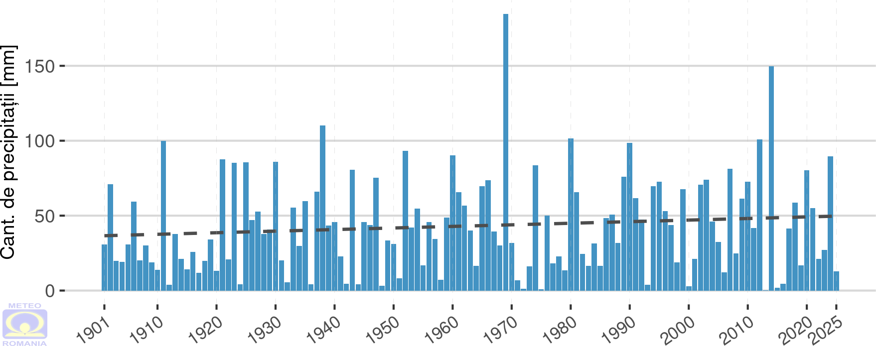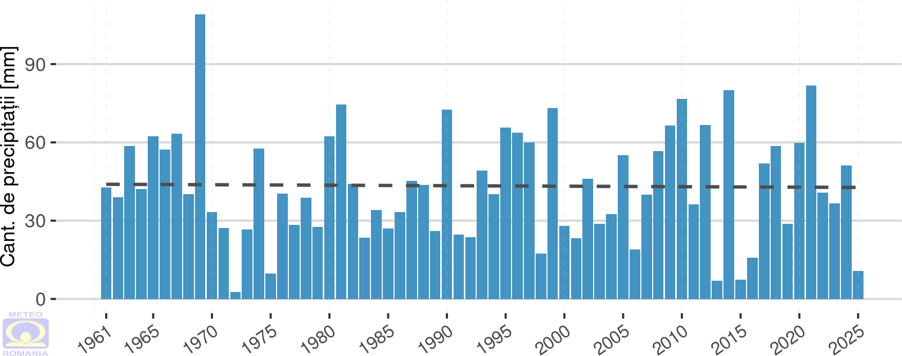 Cantitatea totală de precipitații medie pe țară3 din luna decembrie 2025 a avut valoarea de 10,7 mm, fiind cu 76,9 % mai mică față de mediana intervalului de referință standard (1991 – 2020) (figurile 12 și 13). Astfel, luna decembrie 2025 se clasează pe locul 5 în topul celor mai secetoase luni decembrie, din perioada 1961 - 2025. Pe primul loc se află luna decembrie din anul 1972, cu o medie pe țară de doar 2,7 mm (abatere negativă de 94,3 %).