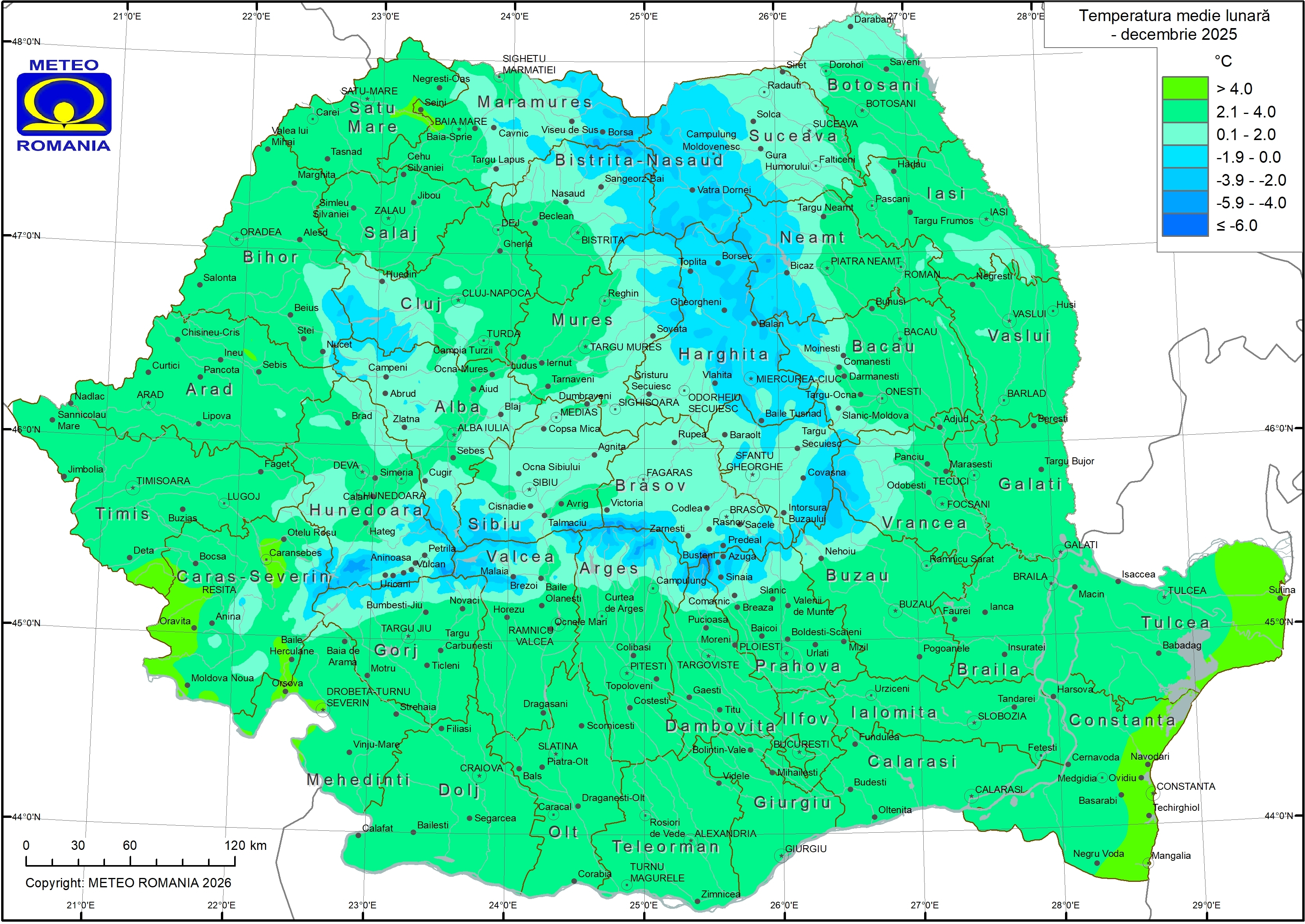 Temperatura medie a lunii decembrie 2025 a avut valori cuprinse între -6,3 °C, la stația meteorologică Vf. Omu și 5,7 °C, la Constanța-Dig (figura 1). Cele mai mari valori, peste 4 °C, s-au înregistrat pe litoral, în jumătatea estică a Deltei Dunării, pe areale restrânse din Banat și izolat, în sud-vestul Olteniei și în centrul Crișanei și al Maramureșului. În cea mai mare parte a țării s-au înregistrat valori cuprinse între 2 și 4 °C. Pe areale extinse din Transilvania, în nordul și centrul Moldovei, în estul Maramureșului și în zonele submontane, mediile termice lunare au fost cuprinse între 0 și 2 °C. Mediile termice au scăzut sub 0 °C odată cu creșterea altitudinii și în majoritatea depresiunilor din Carpații Orientali. În general, în zona montană, mediile termice s-au încadrat între -4 și 0 °C. La altitudini de peste 1800 m, valorile mediilor de temperatură au scăzut sub -4 °C.
