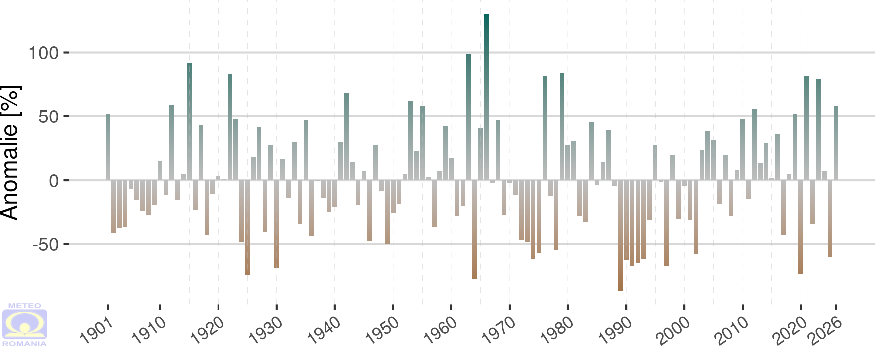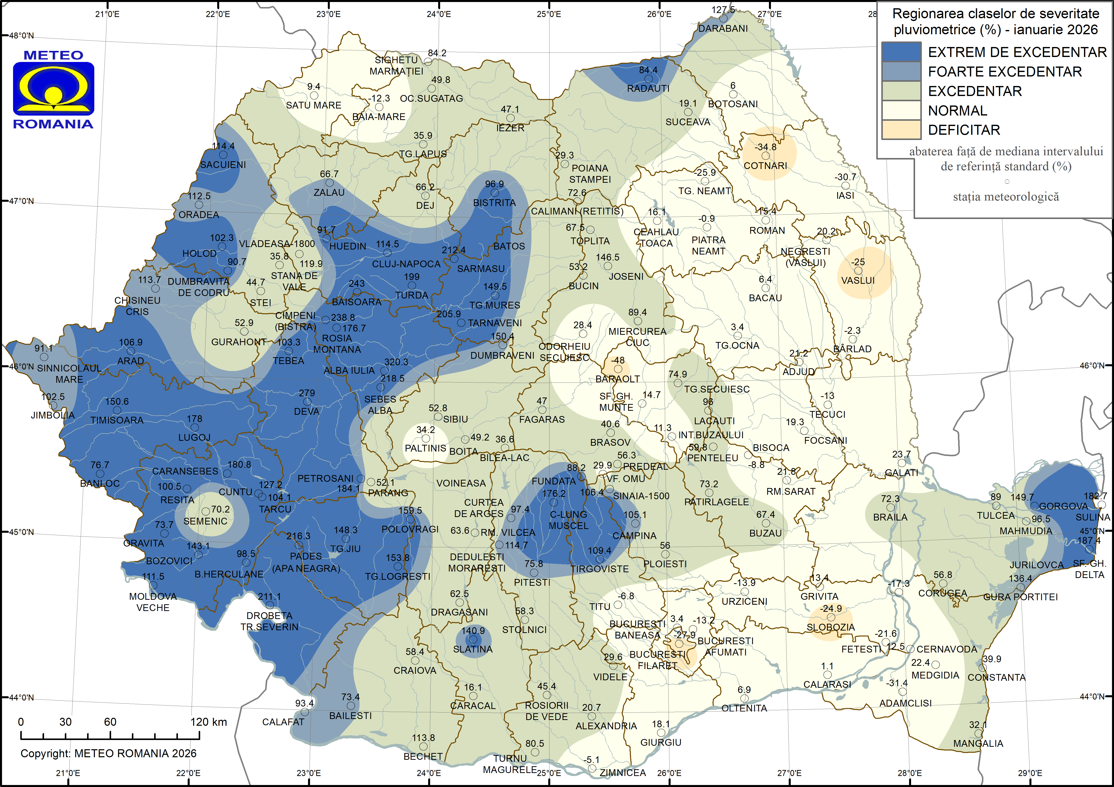 Abaterea cantității de precipitații din luna ianuarie 2026 față de mediana intervalului de referință standard (1991 – 2020), calculată în procente, a fost pozitivă la cele mai multe stații meteorologice din rețeaua Administrației Naționale de Meteorologie (126 stații). La 64 de stații meteorologice, majoritatea localizate în Banat, Crișana și, centrul și vestul Transilvaniei și în vestul Olteniei, abaterea pozitivă a depășit 150 %, iar la 10 dintre acestea, majoritatea din Transilvania, abaterea pozitivă a avut valori peste 200 %. Cea mai mare valoare a abaterii pozitive a fost de 320,3 %, la stația meteorologică Alba Iulia. Abateri negative s-au înregistrat la 20 de stații meteorologice, localizate preponderent în estul, sudul și sud-estul țării, dar și local în sud-estul Transilvaniei, iar cea mai mare valoare a abaterii negative a fost de 48 %, la Baraolt.