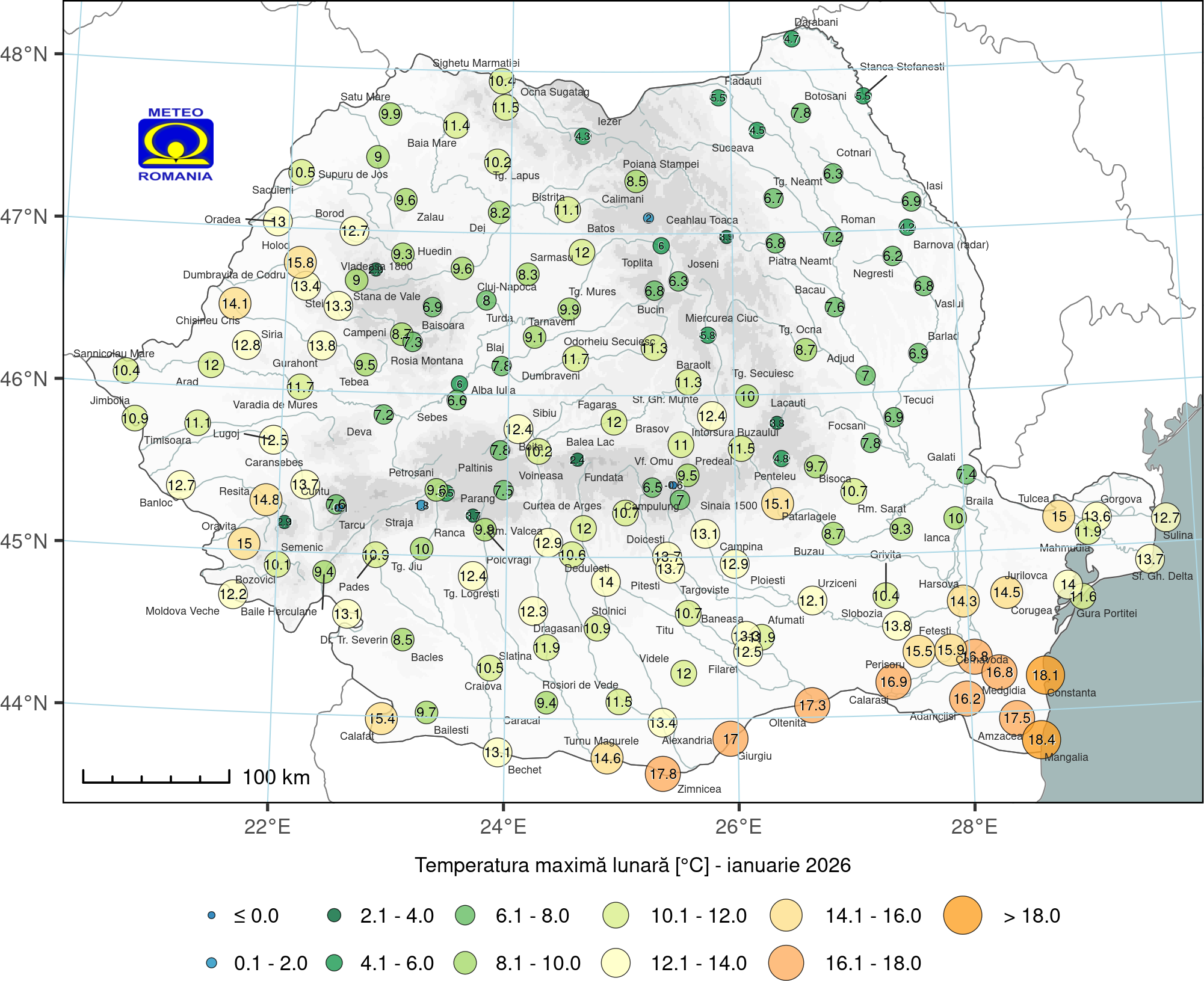 Temperatura maximă lunară din ianuarie 2026, înregistrată la stațiile meteorologice din rețeaua Administrației Naționale de Meteorologie, a fost de 18,4 °C, la Mangalia, în data de 4 ianuarie (figura 7). Cele mai ridicate valori ale temperaturii maxime a aerului, peste 16,0 °C, s-au înregistrat în zona litorală, în sudul Dobrogei și pe areale din lunca Dunării.