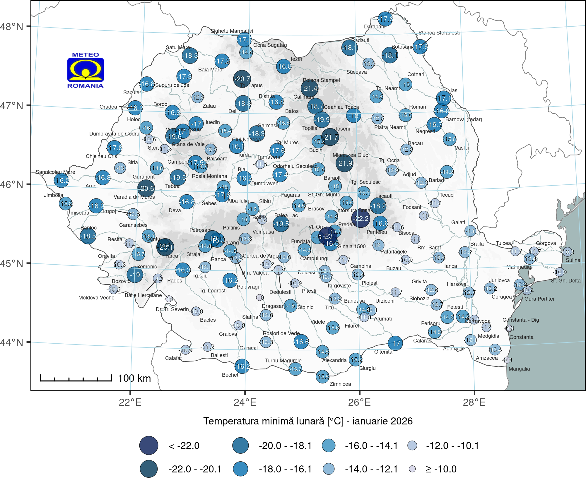 Temperatura minimă lunară, -23,0 °C, s-a înregistrat la stația meteorologică Vf. Omu în data de 1 ianuarie (figura 8). Minimele cele mai scăzute , sub -18 °C, s-au înregistrat în zonele montane înalte, dar și în depresiunile intramontane, unde aerul rece, mai dens și greu, rămâne captiv mai multe zile consecutive, producându-se astfel inversiuni termice.