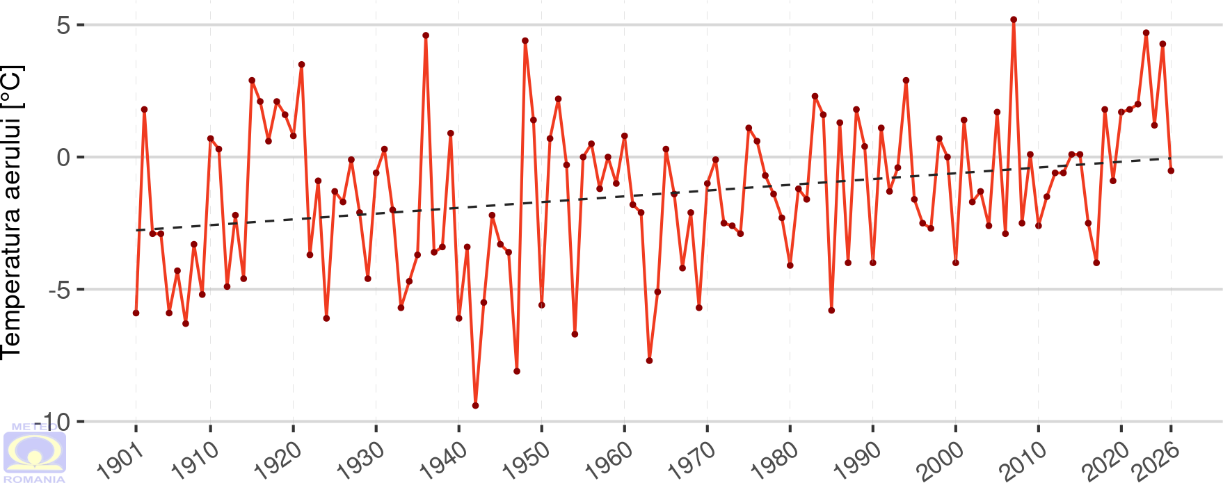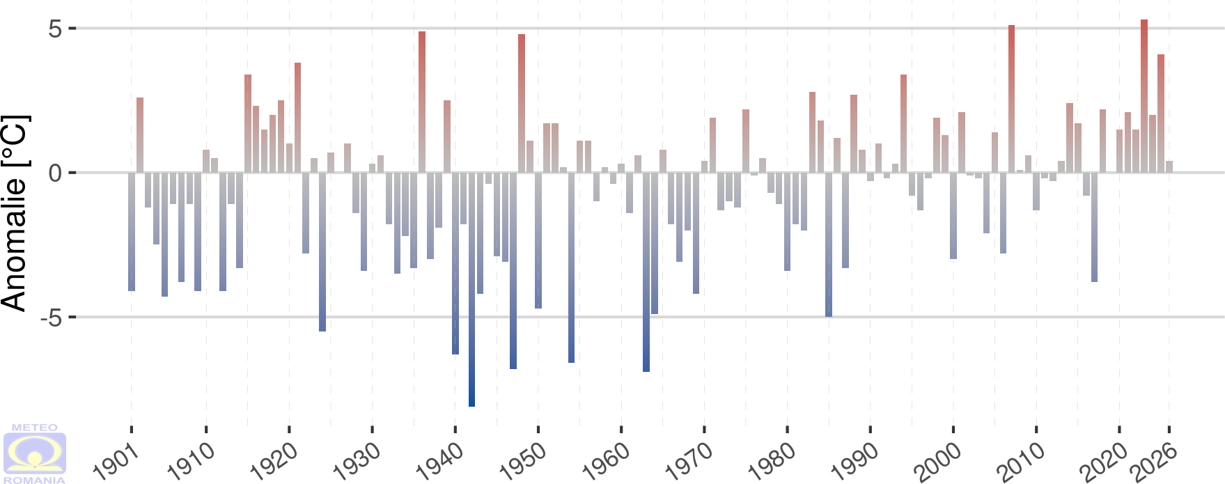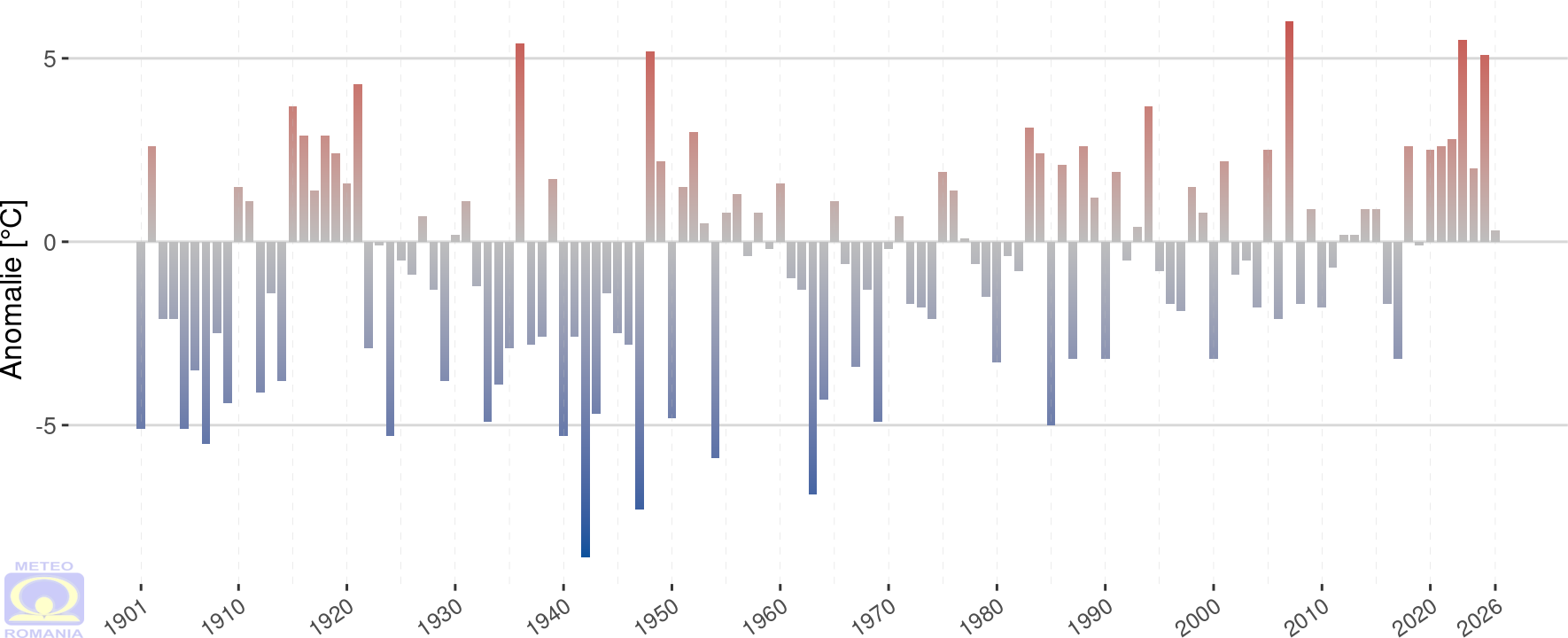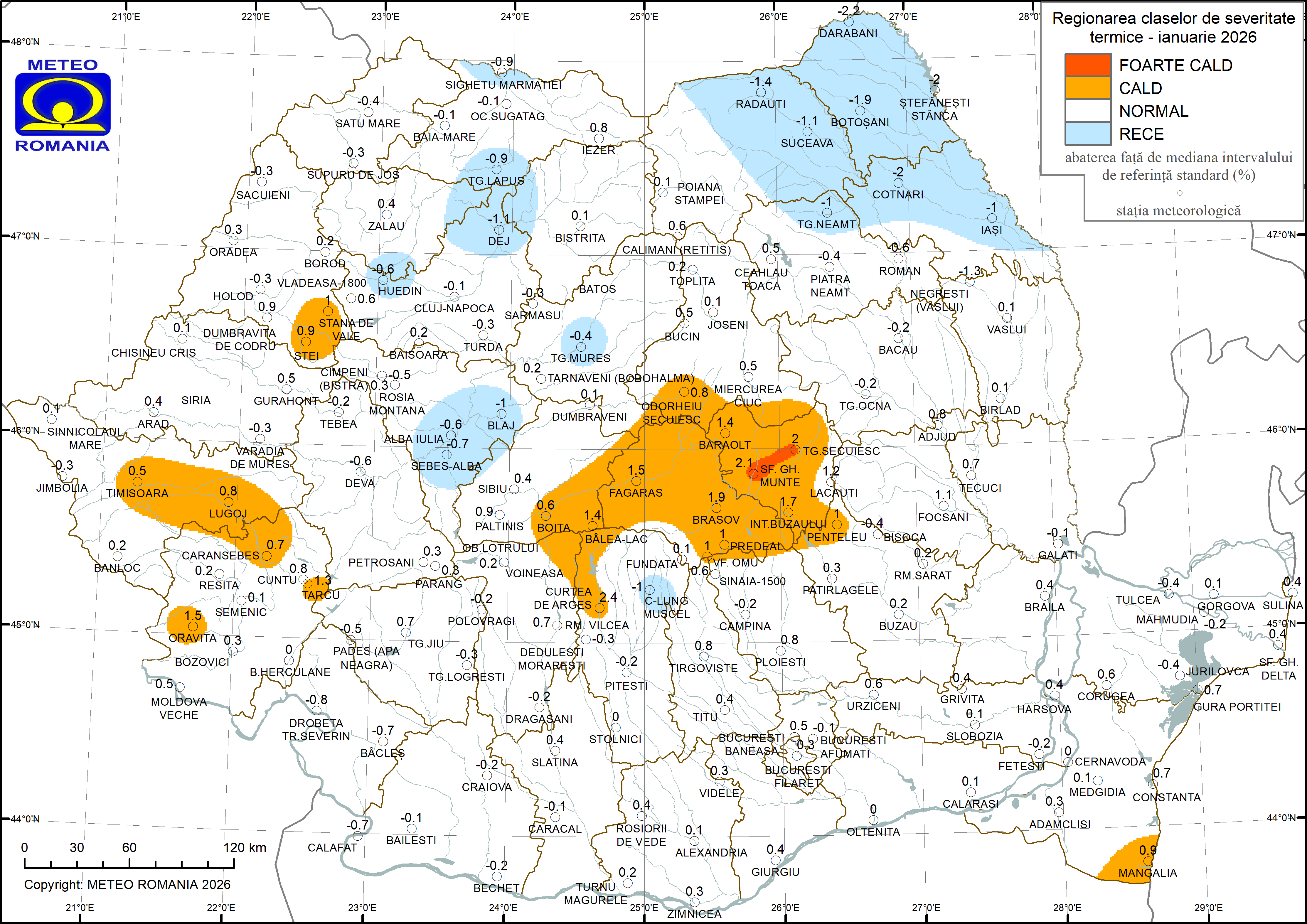 Abaterea temperaturii medii a aerului din luna ianuarie 2026 față de mediana intervalului de referință standard (1991 - 2020) a fost pozitivă la 93 de stații meteorologice localizate în toate regiunile țării, însă valorile acesteia au fost mai mici de 0,5 °C la majoritatea dintre acestea. Pe areale restrânse din centrul Transilvaniei, din Banat, Crișana, din nordul Munteniei și din sudul Moldovei și sudul litoralului s-au înregistrat abateri peste 0,5 °C. Cele mai mari valori ale abaterii pozitive, de peste 1,5 °C, au fost înregistrate în depresiunile intra-montane din Carpații Orientali (Depresiunea Ciuc și Brașov). Valoarea maximă a abaterii pozitive a fost de 2,4 °C și s-a înregistrat la stația meteo Curtea de Argeș. Abateri negative cuprinse între 0,5 și 1,5 °C au fost înregistrate în nordul și nord-estul Moldovei, în vestul Olteniei, local, în Transilvania și Maramureș și izolat, în nordul Munteniei (Câmpulung Muscel). Cele mai mari abateri negative, peste 1,5 °C, s-au înregistrat în județul Botoșani și în nordul județului Iași.