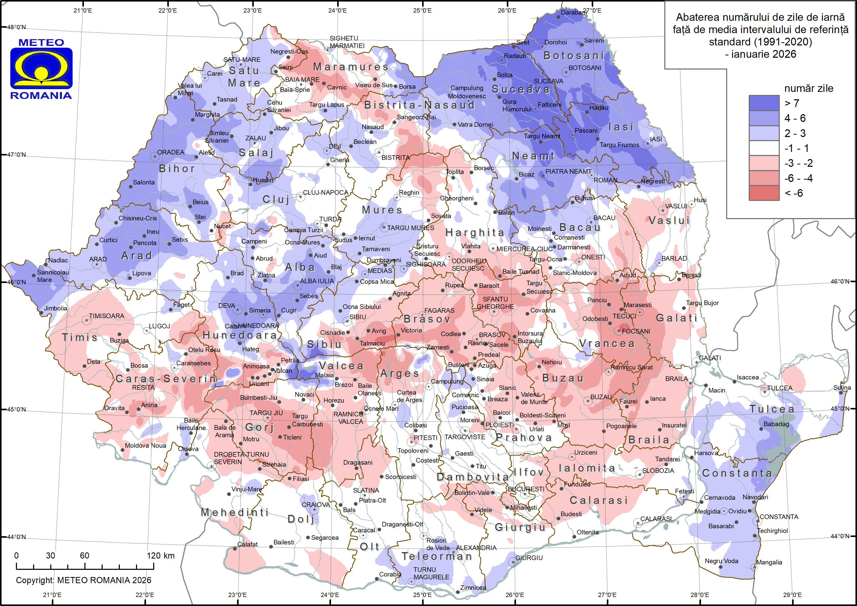 Analiza abaterii numărului de zile de iarnă din ianuarie 2026 față de media intervalului de referință standard (1991 - 2020) indică anomalii preponderent negative în jumătatea sudică a țării, și în general pozitive în jumătatea nordică (figura 12). Cele mai mari abateri negative, de peste 6 zile, s-au înregistrat izolat, în Carpații Meridionali și în sudul Moldovei. Abateri negative cuprinse între 4 și 6 zile s-au înregistrat pe areale din nordul Olteniei, nord-estul Munteniei, sudul Moldovei și în majoritatea zonelor montane. În jumătatea nordică a Olteniei, în nordul și centrul Munteniei, pe areale extinse din Banat, în sud-estul Transilvaniei, pe areale din jumătatea sudică a Moldovei, în zonele sub-montane și local, în Delta Dunării, abaterile negative au avut valori de 2 – 3 zile. Abateri pozitive s-au înregistrat în jumătatea nordică a Moldovei, pe areale extinse din Transilvania, în cea mai mare parte a Crișanei și Dobrogei, în vestul și sudul Maramureșului, în nord-vestul Banatului, în sudul Munteniei în unele zone montane și local, în celelalte regiuni, având în general valori între 2 și 6 zile, valorile mai ridicate, de peste 3 zile, caracterizând preponderent regiunile din jumătatea nordică a țării. Cele mai mari abateri pozitive, de peste 7 zile, s-au înregistrat în Moldova și local, în Carpații Meridionali.