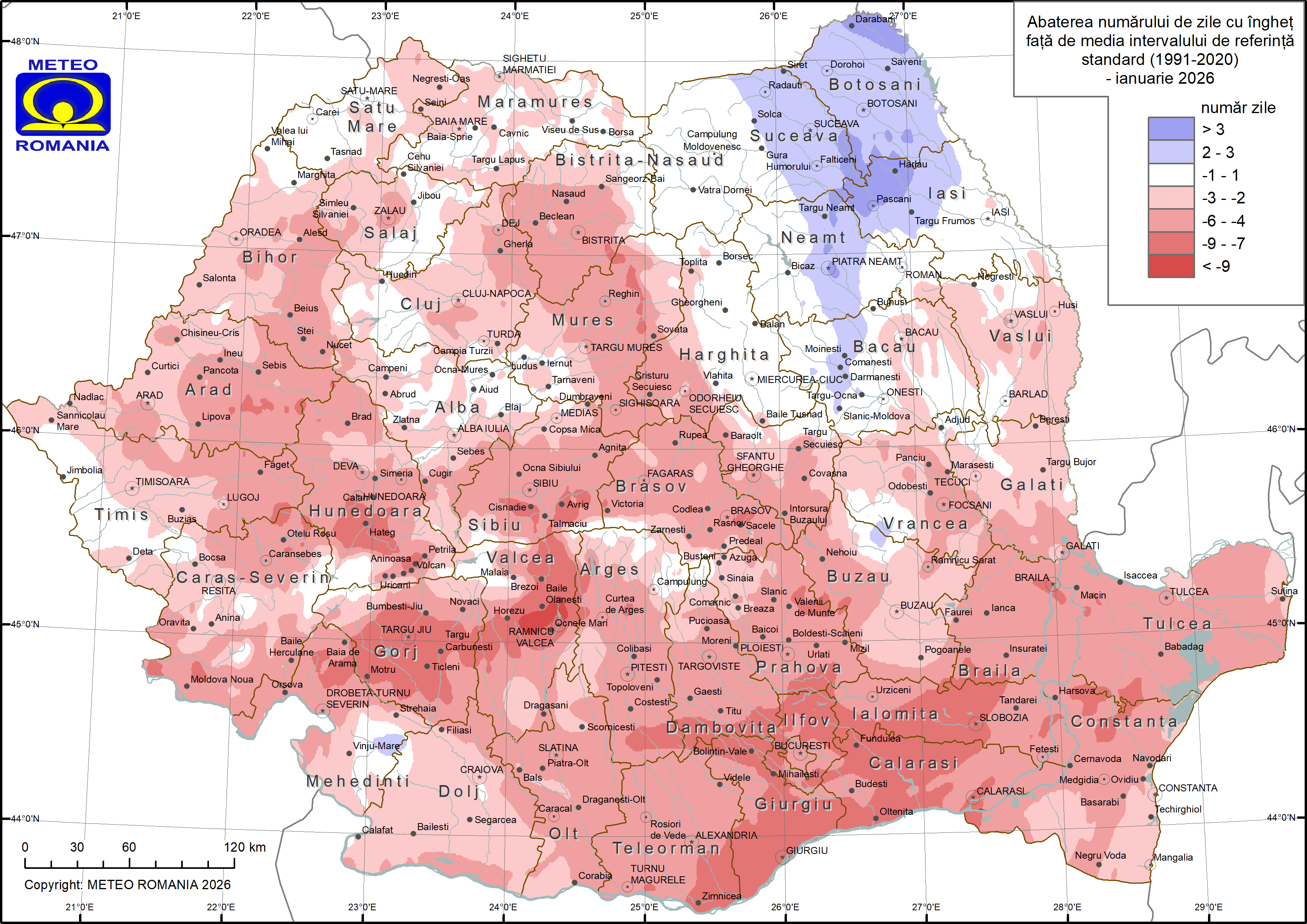 Analiza abaterii numărului de zile cu îngheț din ianuarie 2026 față de media intervalului de referință standard (1991 - 2020) indică anomalii negative în cea mai mare parte a țării (figura 10). Cele mai mari abateri negative, de peste 9 zile, s-au înregistrat local, în zona submontană a Olteniei. În cea mai mare parte a țării, abaterile negative au avut valori de 4 – 6 zile, iar abateri mai mari, de 7 – 9 zile, s-au înregistrat în centrul și sudul Munteniei și în nordul și nord-vestul Olteniei. Abateri pozitive s-au înregistrat în jumătatea nordică a Moldovei și izolat, în sud-vestul Olteniei și în nord-estul Munteniei, având în general valori de 2 – 3 zile. Local, în Moldova, abaterile pozitive au depășit 3 zile.