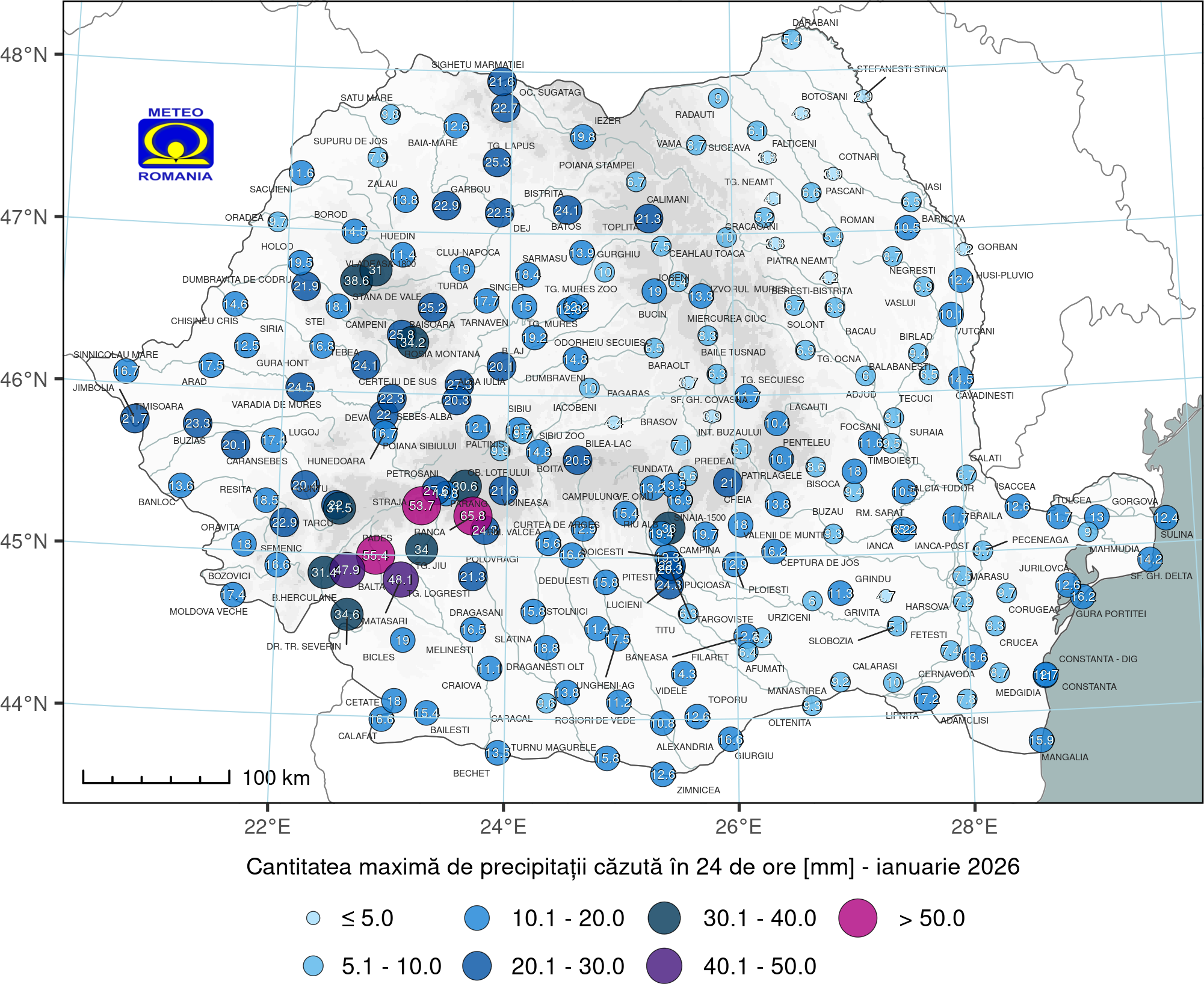Cantitatea maximă de precipitații căzută în 24 de ore din luna ianuarie 2026 a avut valori sub 30 mm în cea mai mare parte a țării (figura 19). În sudul, estul și sud-estul țării, cantitățile maxime au fost în cea mai mare parte sub 15 mm. Valori peste 30 mm s-au înregistrat în zona montană și în zonele submontane din Oltenia. Cele mai mari valori, peste 50 mm, s-au înregistrat în nord-vestul Olteniei. Valoarea maximă pe țară, de 65,8 mm, s-a înregistrat la stația meteorologică Rânca, în data de 27 ianuarie.