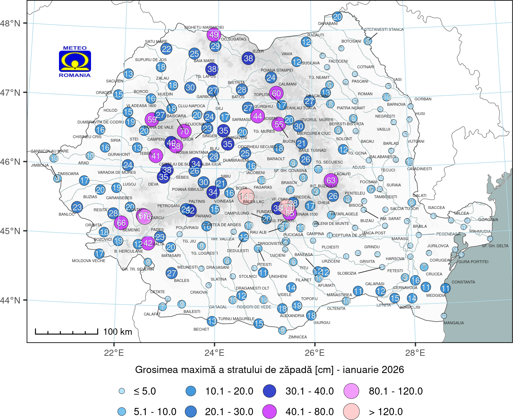 Grosimea maximă a stratului de zăpadă din luna ianuarie 2026 a depășit 140 cm la unele stații din zona montană înaltă, la peste 2000 de metri altitudine (figura 20). Cea mai mare valoare, 171 cm, s-a înregistrat la stația meteo Vf. Omu (Munții Bucegi), iar la Bâlea Lac s-au măsurat 142 cm. În majoritatea zonelor montane, grosimea maximă a stratului de zăpadă a avut în general, valori cuprinse între 40 și 80 cm. În Transilvania și Maramureș, acesta s-a situat între 20 – 40 cm. Între 10 – 20 cm de zăpadă s-au înregistrat în Banat, Crișana, centrul și sudul Munteniei, nord-vestul și sud-estul Olteniei, sudul Dobrogei și în nordul Moldovei. În restul țării, stratul de zăpadă a avut o grosime maximă de până la 5 cm.