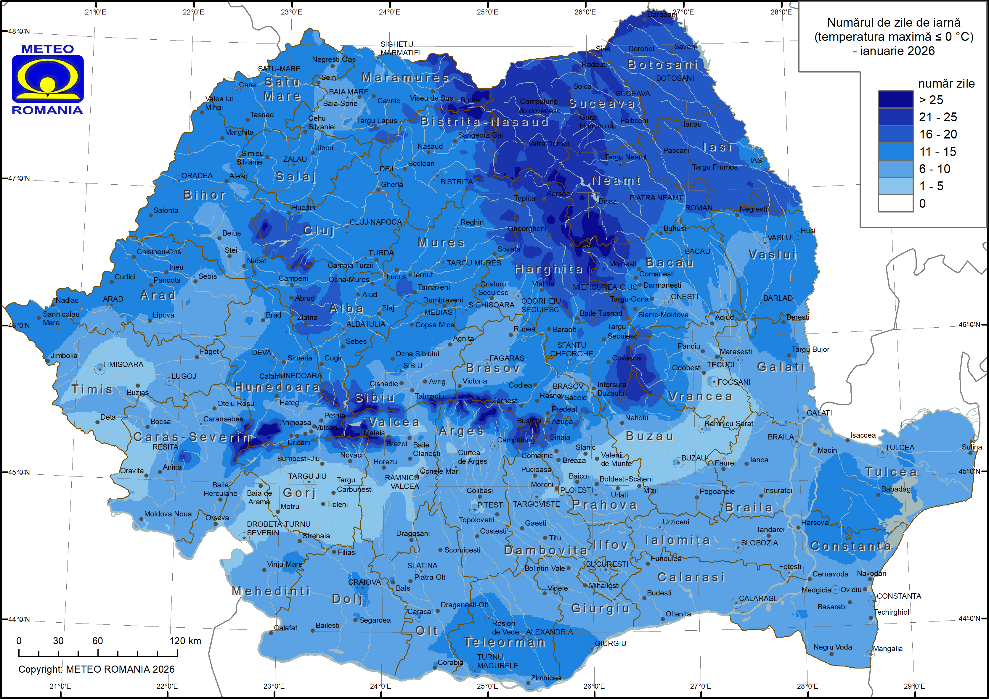 Zile de iarnă (temperatura maximă ≤ 0 °C) s-au înregistrat la nivelul întregii țări, însă cu o frecvență mai ridicată în jumătatea nordică, în zona montană și izolat în unele areale din sudul Munteniei și Dobrogea (figura 11). Numărul cel mai mare de zile de iarnă s-a consemnat în zona montană înaltă din Carpații Orientali și Meridionali și, izolat, în Carpații Occidentali, unde frecvența acestora a depășit 25 de zile. Valori lunare ridicate, cuprinse între 21 și 25 de zile, au caracterizat arealul carpatic de altitudini medii și joase, precum și nordul extrem al Moldovei. În centrul și nordul Moldovei și în zona subcarpatică adiacentă, numărul zilelor de iarnă a fost mai redus, situându-se între 16 și 20 de zile. În depresiunile intramontane din Carpații Orientali, în regiunile subcarpatice, în cea mai mare parte a Transilvaniei, Maramureșului și Crișanei, precum și în sudul Moldovei și pe areale restrânse din Muntenia și Dobrogea, s-au înregistrat între 11 și 15 zile de iarnă. În zonele de câmpie din sud-vestul, sudul și estul țării, respectiv în Banat, Oltenia, Muntenia și Dobrogea, inclusiv pe litoral și în Delta Dunării, frecvența a fost mai scăzută, cu 6 – 10 zile de iarnă. Cele mai reduse valori, de 1 – 5 zile, s-au înregistrat local în sudul Banatului și izolat în nordul Olteniei și al Munteniei.