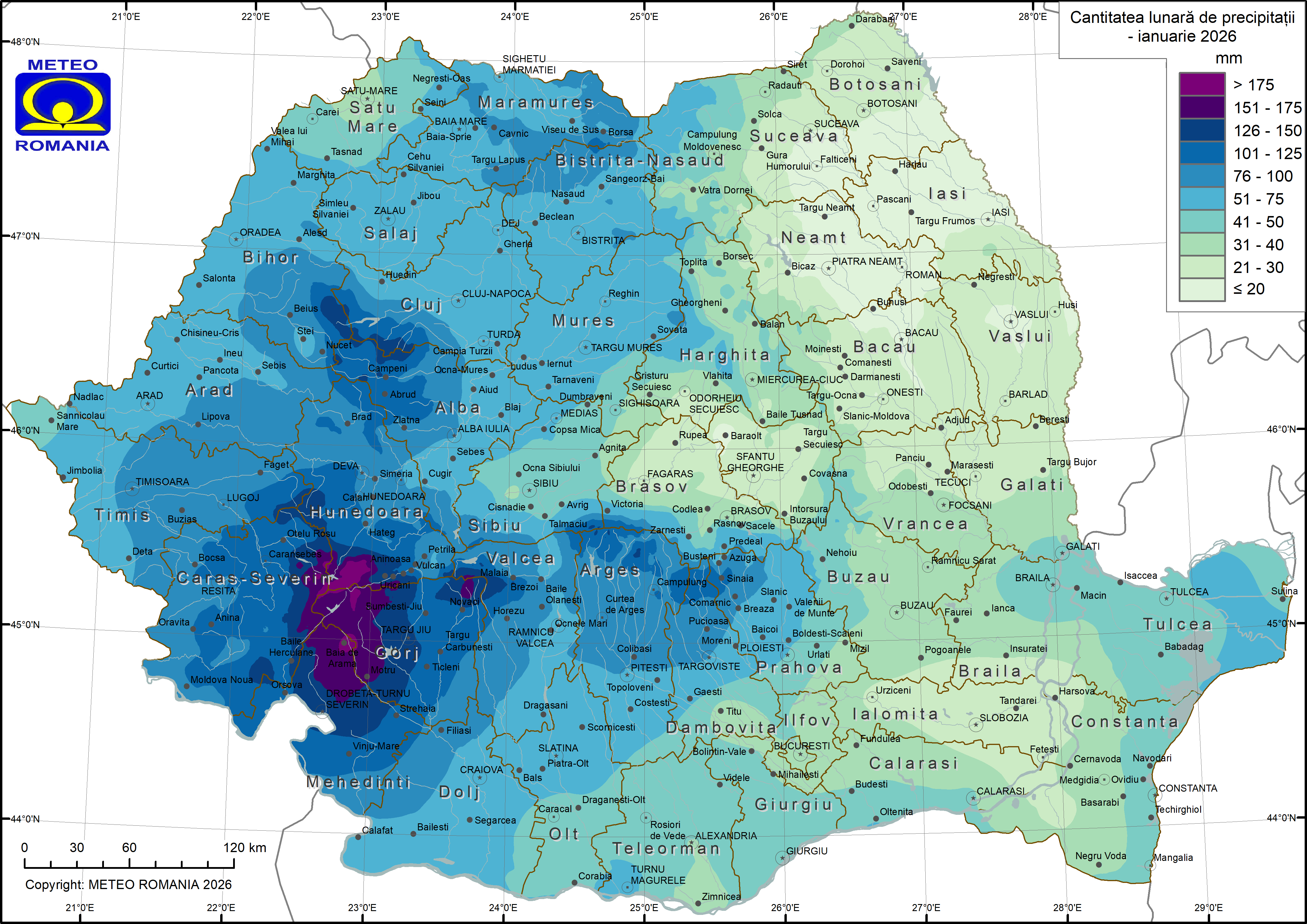 Cantitatea totală de precipitații din luna ianuarie 2026 a avut valori peste 150 mm în nord-vestul Olteniei, iar local s-au înregistrat și valori de peste 175 mm (figura 13). Valori cuprinse între 76 și 150 mm s-au înregistrat pe areale extinse din Banat și vestul Olteniei, nordul Munteniei, Maramureș și din zona montană. În Crișana, în cea mai mare parte a Transilvaniei, sudul Munteniei și al Olteniei, în estul Dobrogei și în Delta Dunării cantitatea totală lunară de precipitații a avut valori cuprinse între 40 și 75 mm. În Moldova, în sud-estul Transilvaniei (Depresiunea Brașovului), în estul Munteniei și în vestul și sudul Dobrogei, valorile lunare au fost sub 40 mm, iar izolat, sub 20 mm.