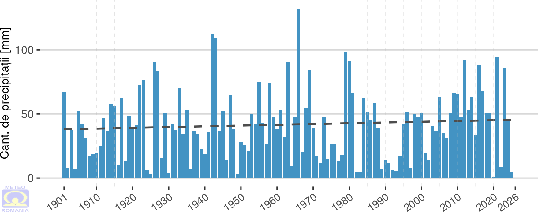 Cea mai mare cantitate lunară s-a înregistrat la stația meteorologică Padeș (Apa Neagră) și a fost de 184,1 mm.