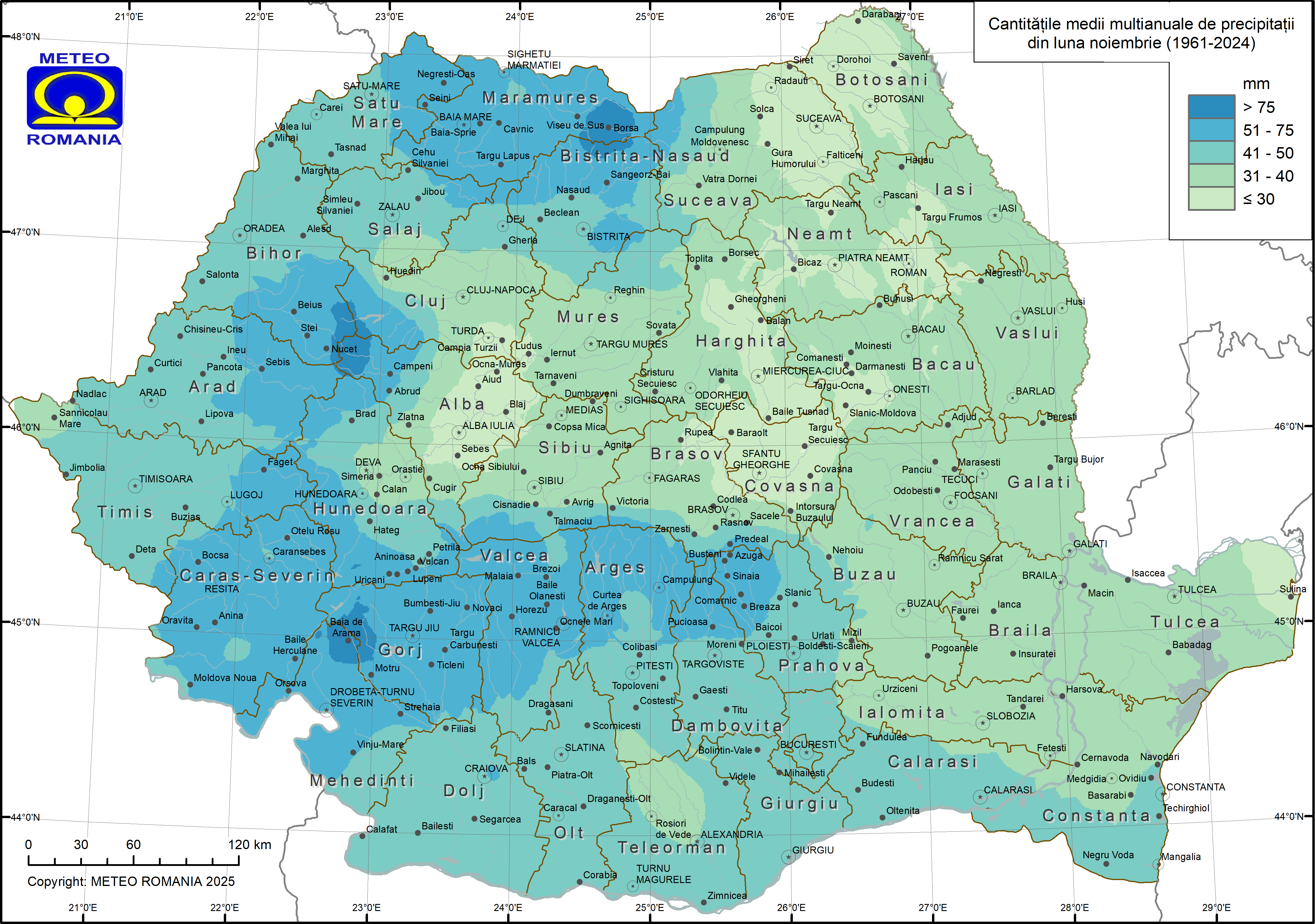 Regimul precipitaţiilor din luna noiembrie înregistrează o uşoară creştere faţă de luna precedentă. Astfel, din datele înregistrate în perioada 1961–2024 la stațiile meteorologice din rețeaua Administrației Naționale de Meteorologie, se observă o creştere a cantităţii lunare de precipitaţii, medie multianuală (1961-2024), în sudul şi sud-vestul ţării, precum şi în vestul şi nord-vestul acesteia, ca urmare a advecției maselor de aer umed dinspre Marea Mediterană (figura 2). În aceste zone, cantitatea lunară, medie multianuală, este cuprinsă între 50 şi 75 mm. Cantități peste 75 mm se înregistrează în zona montană înaltă (peste 1500 m). Valori lunare, medii multianuale cuprinse între 30 şi 50 mm sunt caracteristice Dobrogei, Munteniei, Moldovei şi majorităţii zonelor din Transilvania. Valori medii multianuale mai mici de 30 mm se înregistrează în Delta Dunării, pe areale din vestul şi estul Transilvaniei, dar şi pe areale din jumătatea de nord a Moldovei.