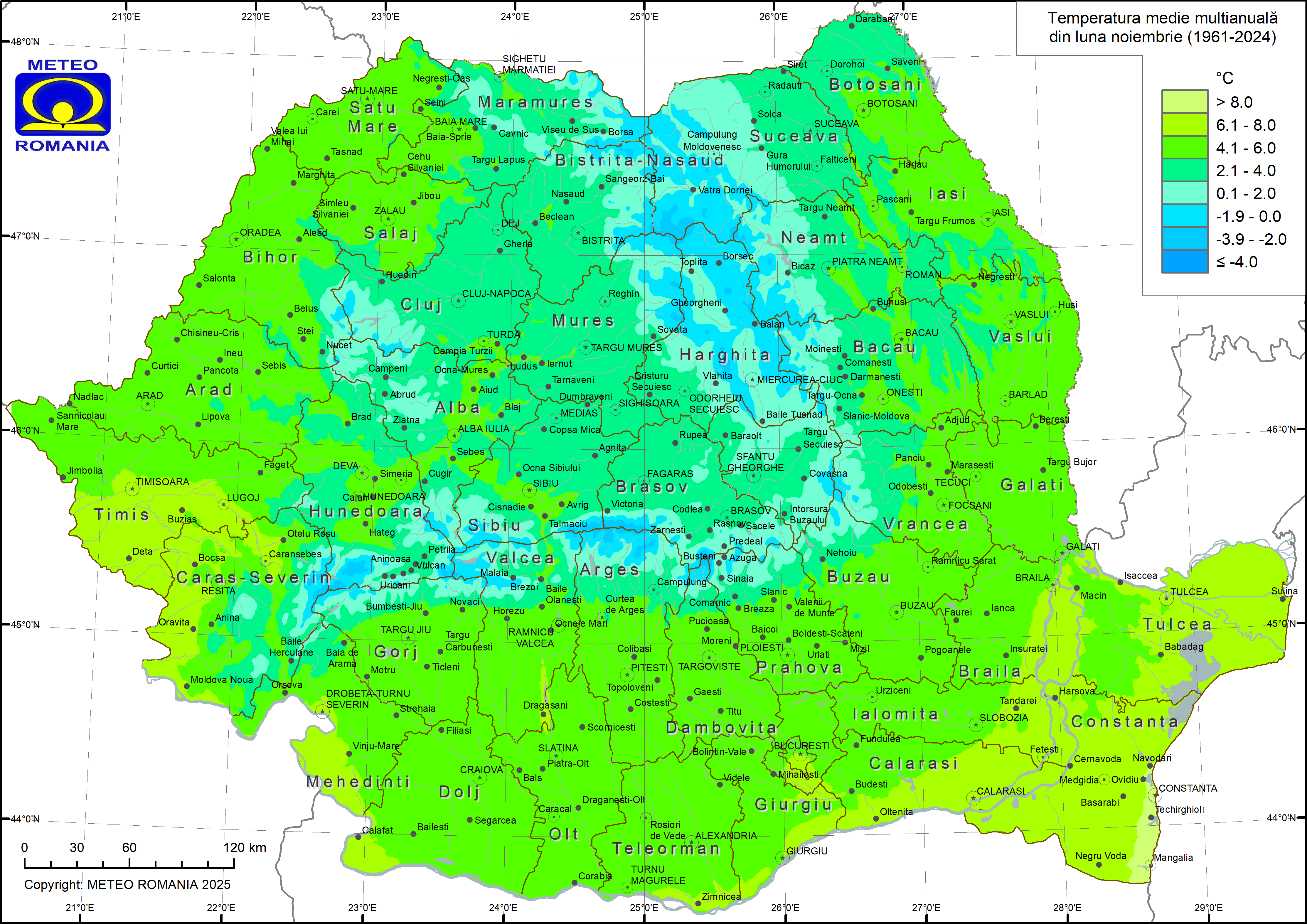 Din datele înregistrate în perioada 1961–2024 la stațiile meteorologice din rețeaua Administrației Naționale de Meteorologie, se constată că temperatura medie multianuală a lunii noiembrie (figura 1) nu depăşeşte 8 ºC decât în zona litoralului. În zonele joase din Dobrogea şi Banat, dar şi în Lunca Dunării, mediile de temperatură se situează între 6 şi 8 ºC. În zonele de câmpie şi de deal din Muntenia, Oltenia, Moldova, Banat, Crişana şi Maramureş sunt caracteristice valori medii între 4 şi 6 ºC. În Transilvania, nordul și centrul Moldovei, în Subcarpaţii Moldovei și Subcarpații de Curbură, precum și în estul Maramureșului, temperatura medie variază între 2 şi 4 ºC. În zona montană joasă şi în depresiunile intramontane sunt caracteristice temperaturi medii cuprinse între -2 şi 2 ºC, iar în zona montană înaltă (peste 1500 m) aceste valori coboară sub -2 ºC şi uneori, sub -4 ºC .