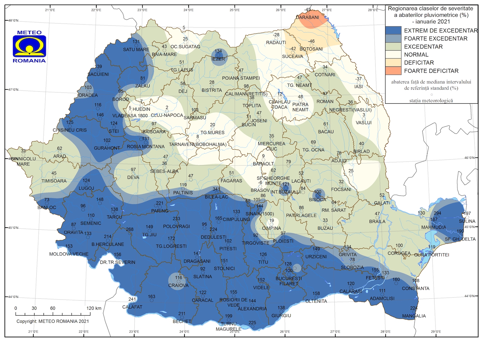 Abaterea cantității de precipitații din luna ianuarie 2021 față de mediana intervalului de referință standard (1991-2020), calculată în procente, a fost pozitivă în aproape toată țara. Valori ridicate ale abaterii pozitive, peste 100%, s-au înregistrat pe areale extinse din Muntenia, Oltenia, Banat, Crișana, în Delta Dunării, sudul Dobrogei şi izolat, în rest. Cea mai mare valoare a abaterii pozitive a fost 341,2%, la stația meteorologică Bâlea-Lac.