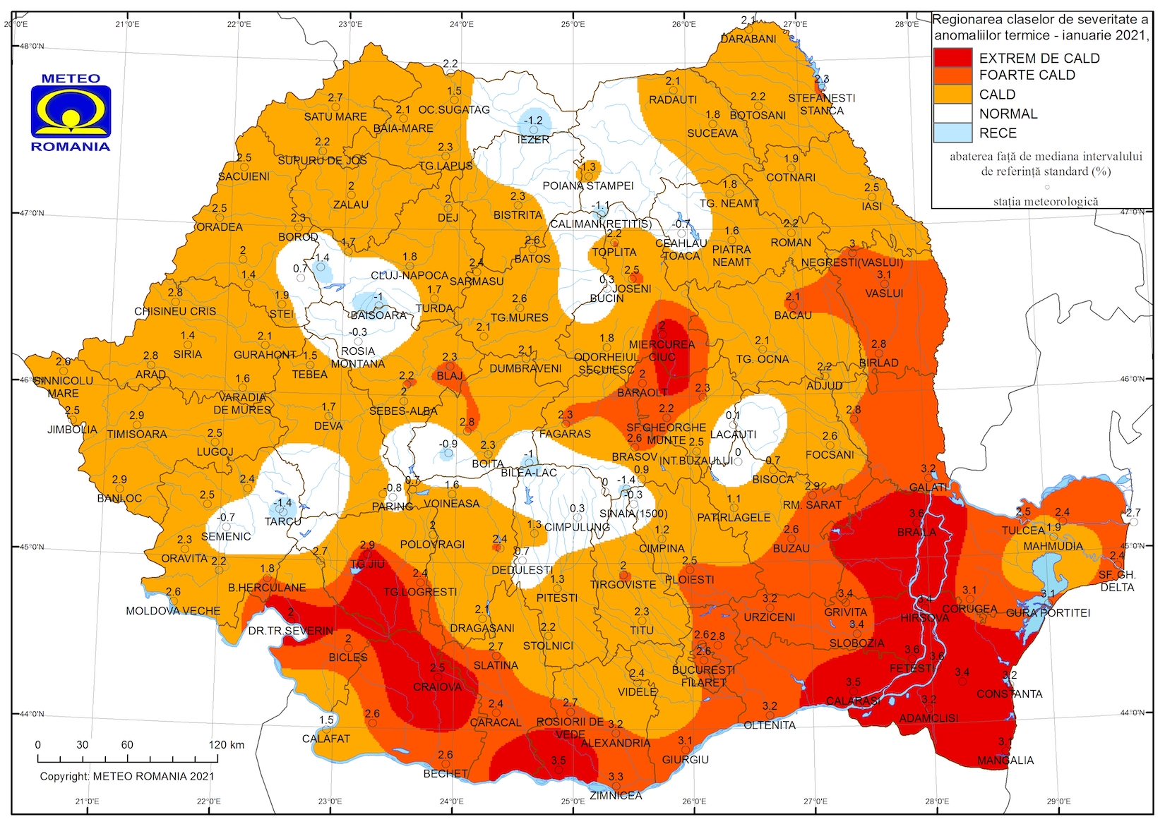 Analizând încadrarea în clase de severitate a anomaliilor termice din luna ianuarie 2021 (fig. 2), se poate observa că regimul termic a fost cald și foarte cald în aproape toată ţara, iar pe areale din Muntenia, Oltenia, Dobrogea și Carpații Orientali acesta a fost extrem de cald. Regimul termic s-a încadrat în limite normale doar în unele zone montane și a fost rece local, în zona montană înaltă.