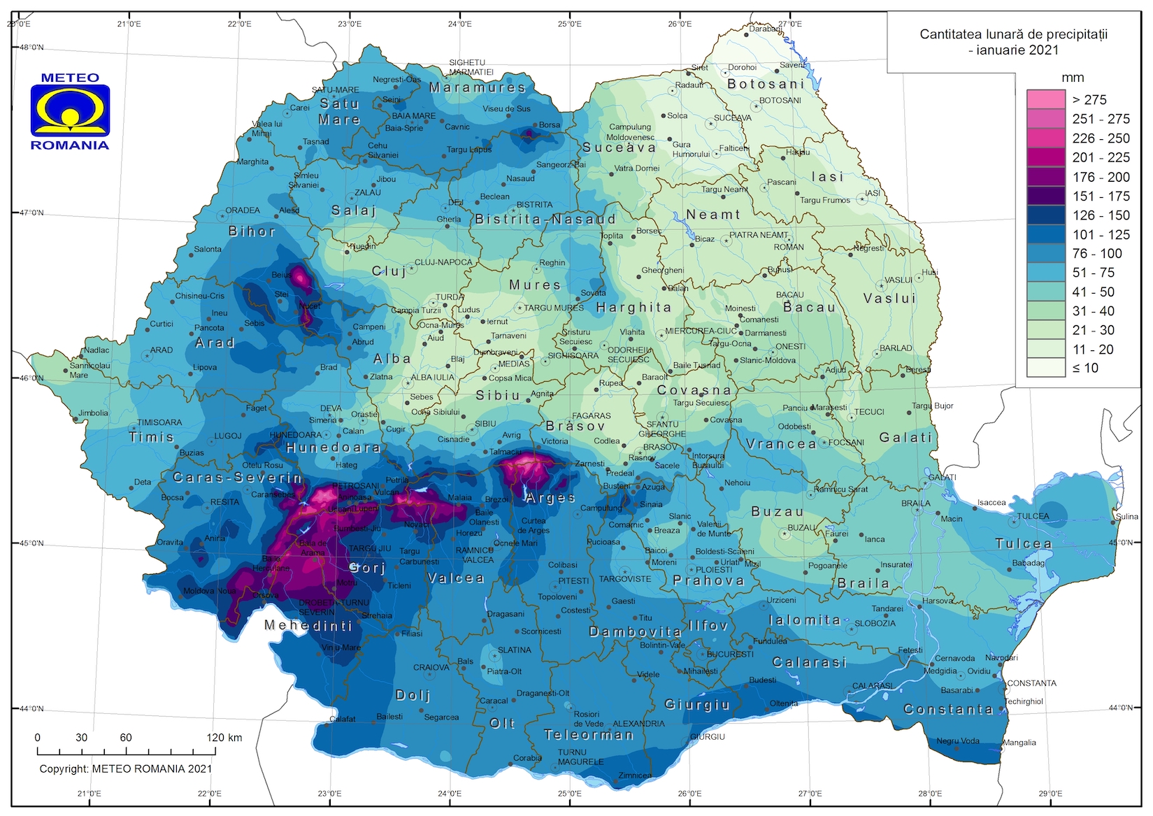 Cantitatea totală de precipitații din luna ianuarie 2021 (fig. 3) a avut valori ridicate, peste 40 mm, mai ales în sud-vestul, sudul, vestul și nord-vestul ţării. Cantităţi de precipitaţii sub 40 mm au fost înregistrate în Moldova, centrul Transilvaniei, pe areale extinse din Carpații Orientali și izolat, în Muntenia și Banat. Pe areale restrânse din Carpații Meridionali și Occidentali, cantitatea de precipitaţii a depăşit 150 mm. Cea mai mare valoare a cantităţii totale de precipitaţii din luna ianuarie 2021 a fost de 289,2 mm și a fost înregistrată la stația meteorologică Bâlea-Lac.