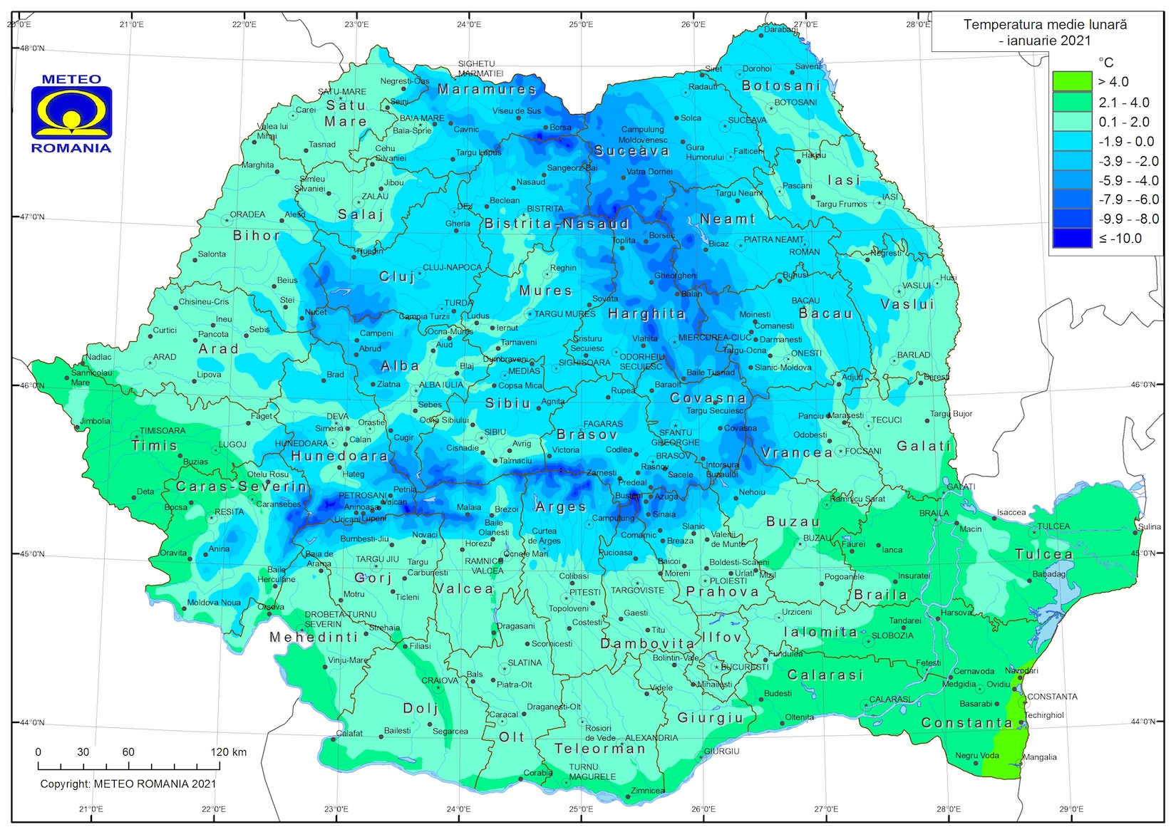 Temperatura medie a lunii ianuarie 2021 (fig. 1) a avut valori cuprinse între -11,2°C, la stația meteorologică Vf. Omu și 4,8°C, la stația meteorologică Mangalia. Cele mai mari valori, peste 4°C, s-au înregistrat în sudul litoralului. Mediile lunare de temperatură au fost cuprinse între 0 și 4°C în aproape toate zonele din Muntenia, Oltenia, Dobrogea, Banat și Crișana, pe areale extinse din sudul și estul Moldovei, nord-vestul Maramureșului și local, în Transilvania și centrul Moldovei. În restul țării, valorile temperaturii medii lunare au fost negative. În zona montană, media lunară de temperatură a variat între -10 și -4°C, iar pe crestele înalte, aceasta a avut valori sub -10°C, ajungând la staţia meteorologică Vf. Omu la -11,2°C.